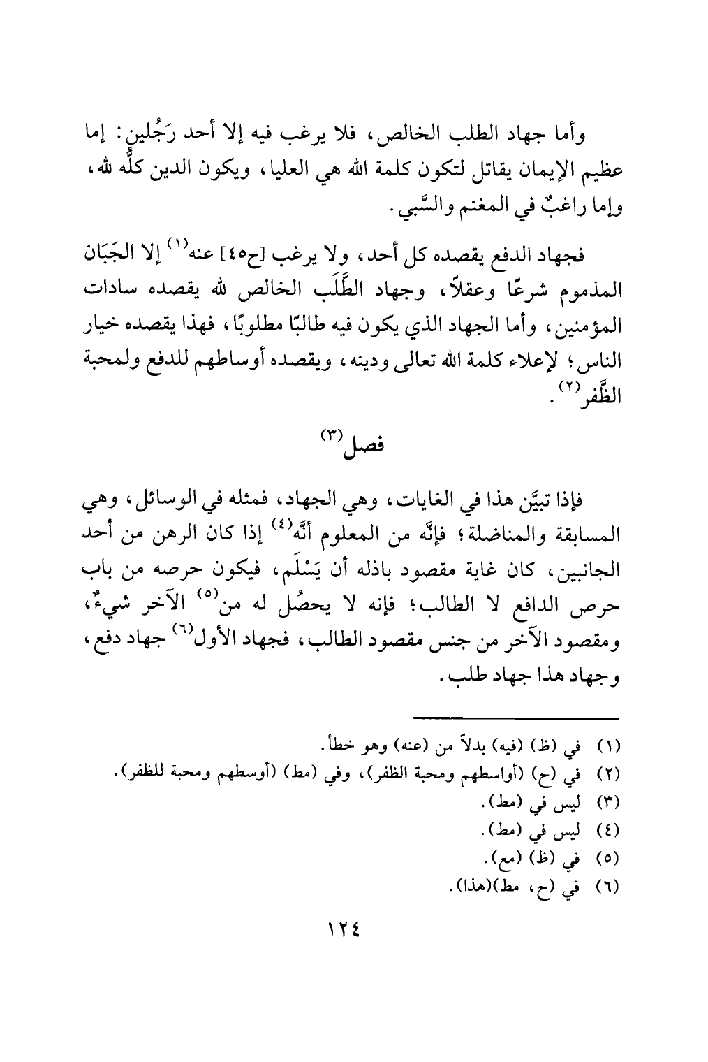 فجهاد الدفع يقصده كل أحد، ولا يرغب [ح 45] عنه (¬1) إلا الجَبَان المذموم شرعًا وعقلًا، وجهاد الطَّلَب الخالص لله يقصده سادات المؤمنين، وأما الجهاد الذي يكون فيه طالبًا مطلوبًا، فهذا يقصده خيار الناس؛ لإعلاء كلمة الله تعالى ودينه، ويقصده أوساطهم للدفع ولمحبة الظَّفر (¬2).