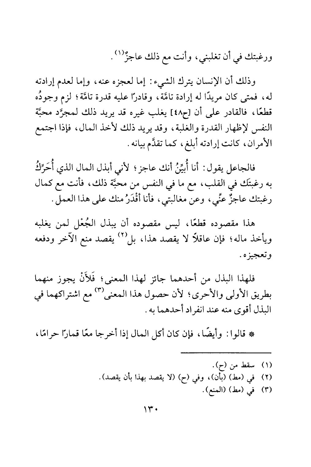 وذلك أن الإنسان يترك الشيء: إما لعجزه عنه، وإما لعدم إرادته له، فمتى كان مريدًا له إرادة تامَّة، وقادرًا عليه قدرة تامَّة؛ لزم وجودُه قطعًا، فالقادر على أن [ح 48] يغلب غيره قد يريد ذلك لمجرَّد محبَّة النفس لإظهار القدرة والغلبة، وقد يريد ذلك لأخذ المال، فإذا اجتمع الأمران، كانت إرادته أبلغ، كما تقدَّم بيانه.