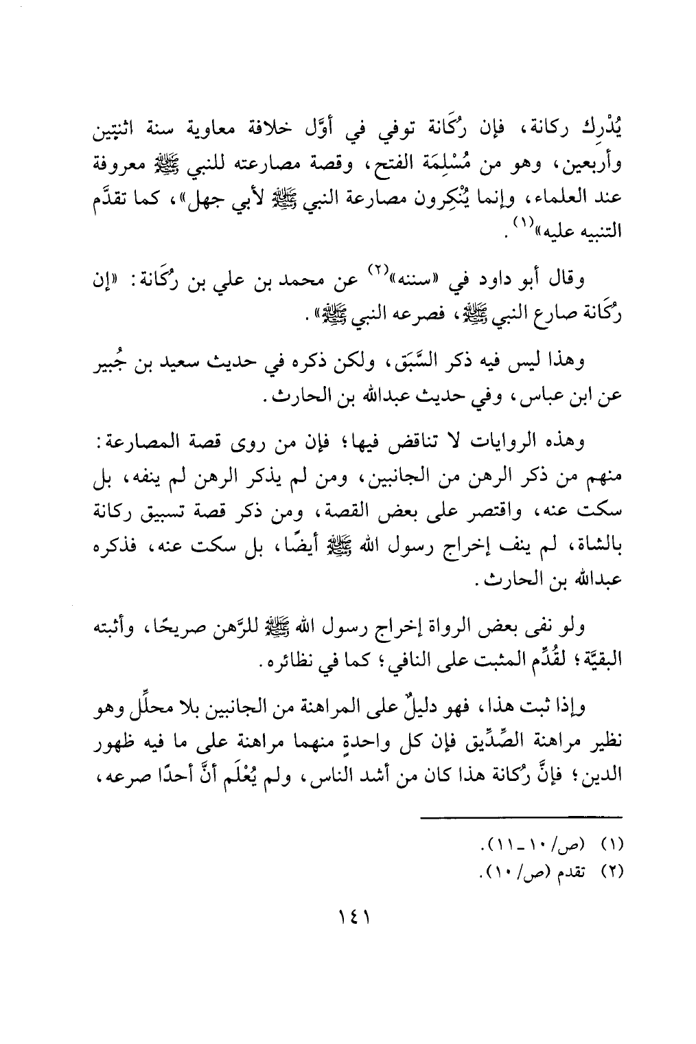 يُدْرِك ركانة، فإن رُكَانة توفي في أوَّل خلافة معاوية سنة اثنتين وأربعين، وهو من مُسْلِمَة الفتح، وقصة مصارعته للنبي - صلى الله عليه وسلم - معروفة عند العلماء، وإنما يُنْكِرون مصارعة النبي - صلى الله عليه وسلم - لأبي جهل"، كما تقدَّم التنبيه عليه" (¬1).