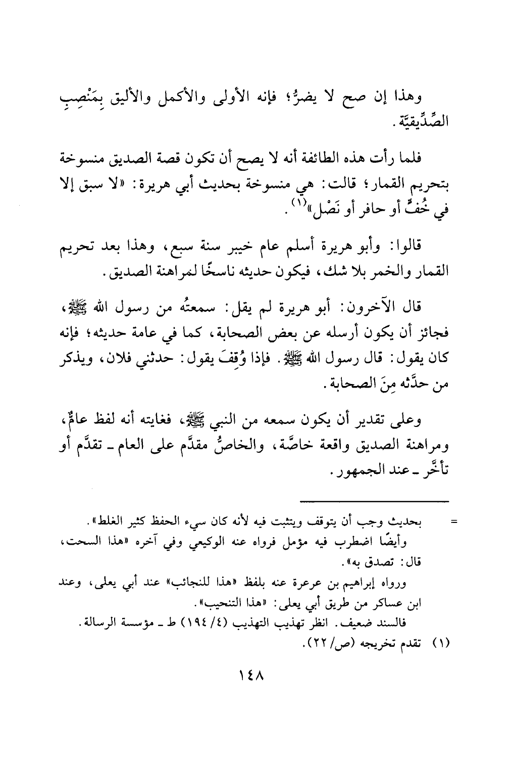 فلما رأت هذه الطائفة أنه لا يصح أن تكون قصة الصديق منسوخة بتحريم القمار؛ قالت: هي منسوخة بحديث أبي هريرة: "لا سبق إلا في خُفٍّ أو حافر أو نَصْل" (¬1).