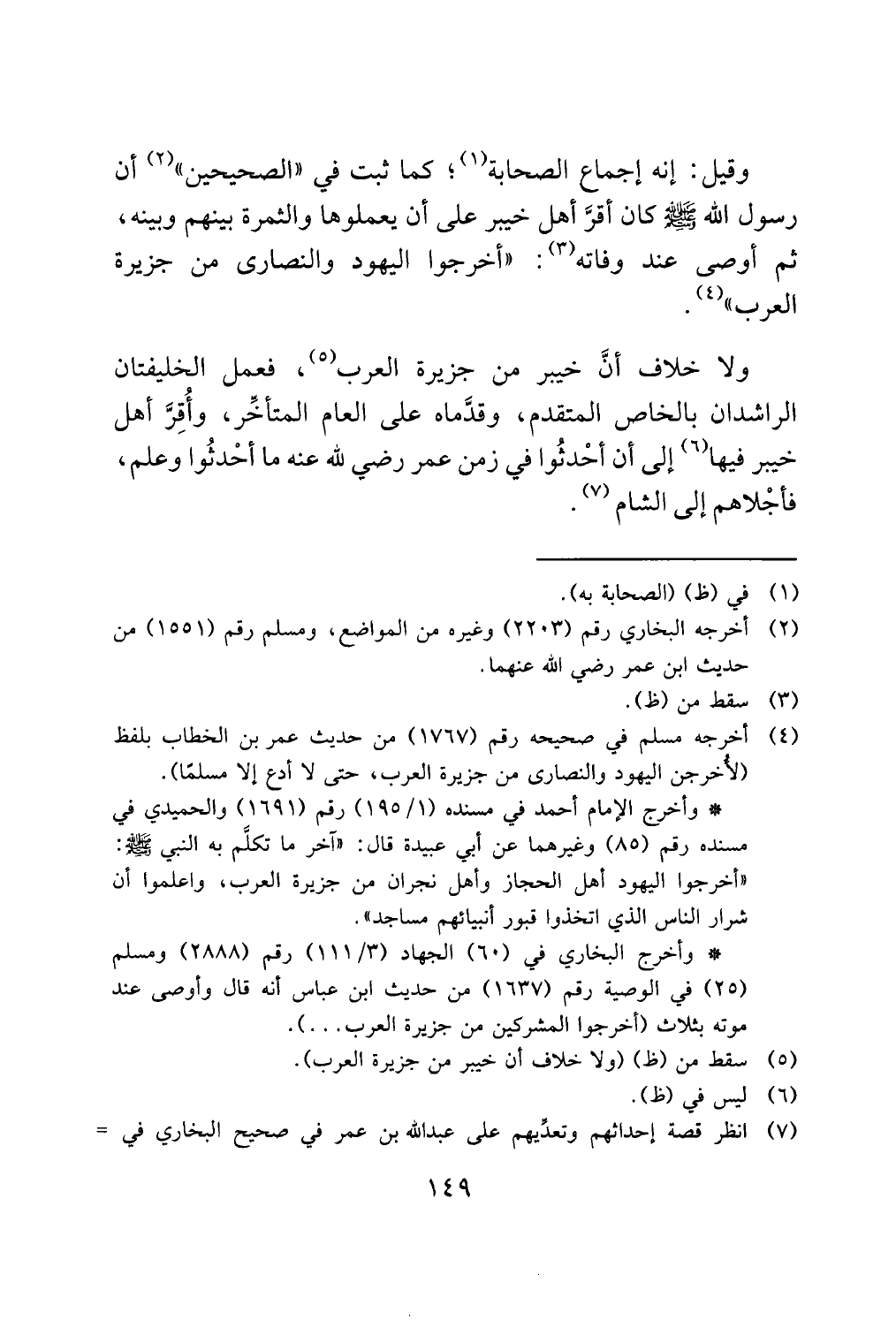 وقيل: إنه إجماع الصحابة (¬1)؛ كما ثبت في "الصحيحين" (¬2) أن رسول الله - صلى الله عليه وسلم - كان أقرَّ أهل خيبر على أن يعملوها والثمرة بينهم وبينه، ثم أوصى عند وفاته (¬3): "أخرجوا اليهود والنصارى من جزيرة العرب" (¬4).