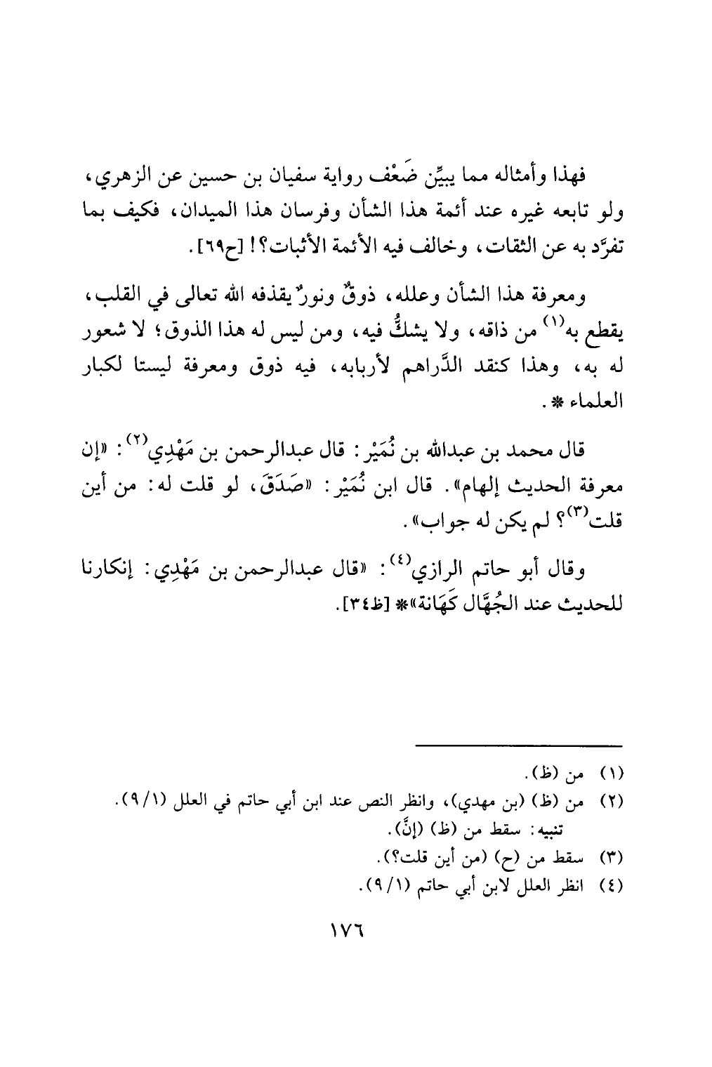 قال محمد بن عبد الله بن نُمَيْر: قال عبد الرحمن بن مَهْدِي (¬2): "إن معرفة الحديث إلهام". قال ابن نُمَيْر: "صَدَقَ، لو قلت له: من أين قلت (¬3)؟ لم يكن له جواب".