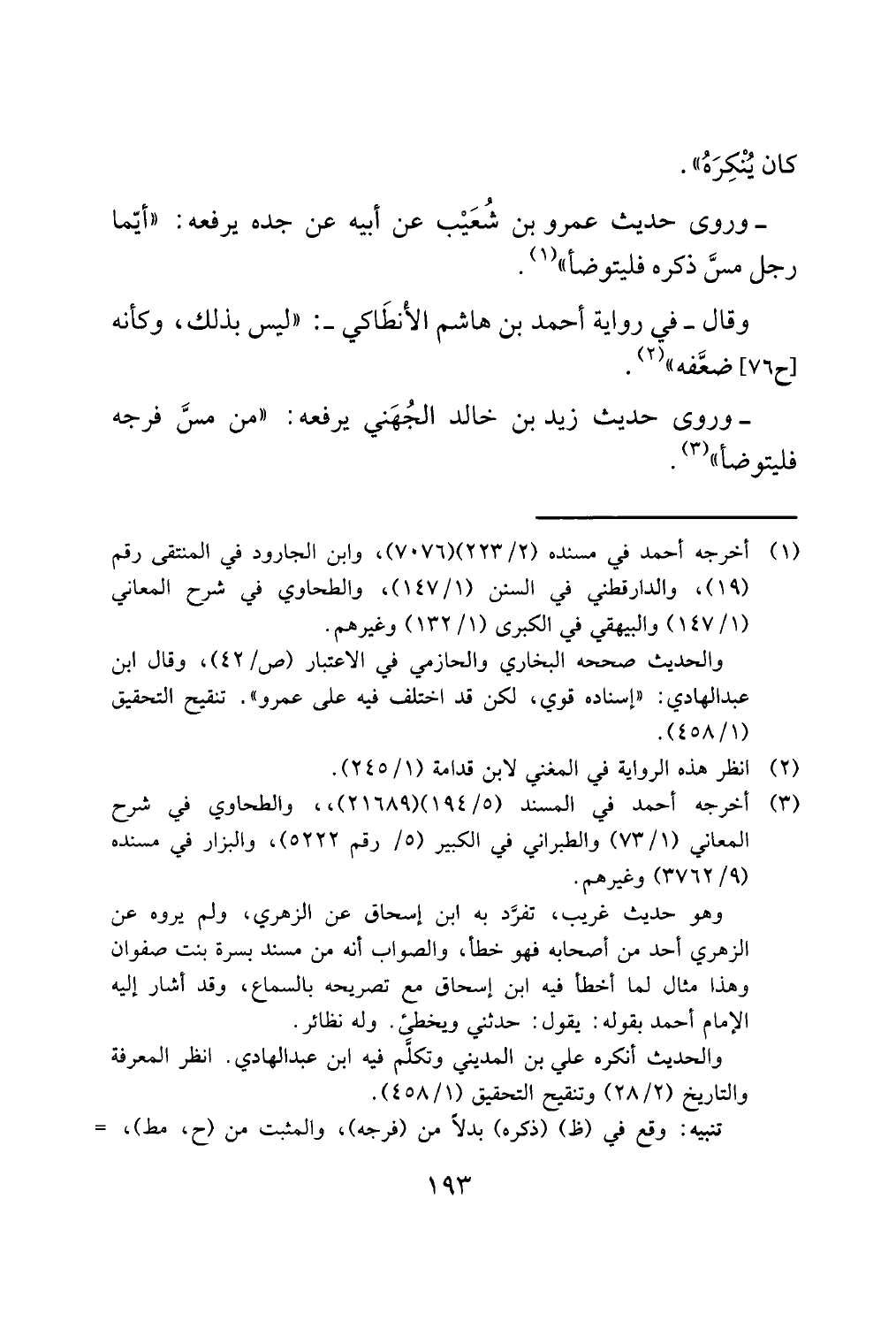 - وروى حديث عمرو بن شُعَيْب عن أبيه عن جده يرفعه: "أيّما رجل مسَّ ذكره فليتوضأ" (¬1).