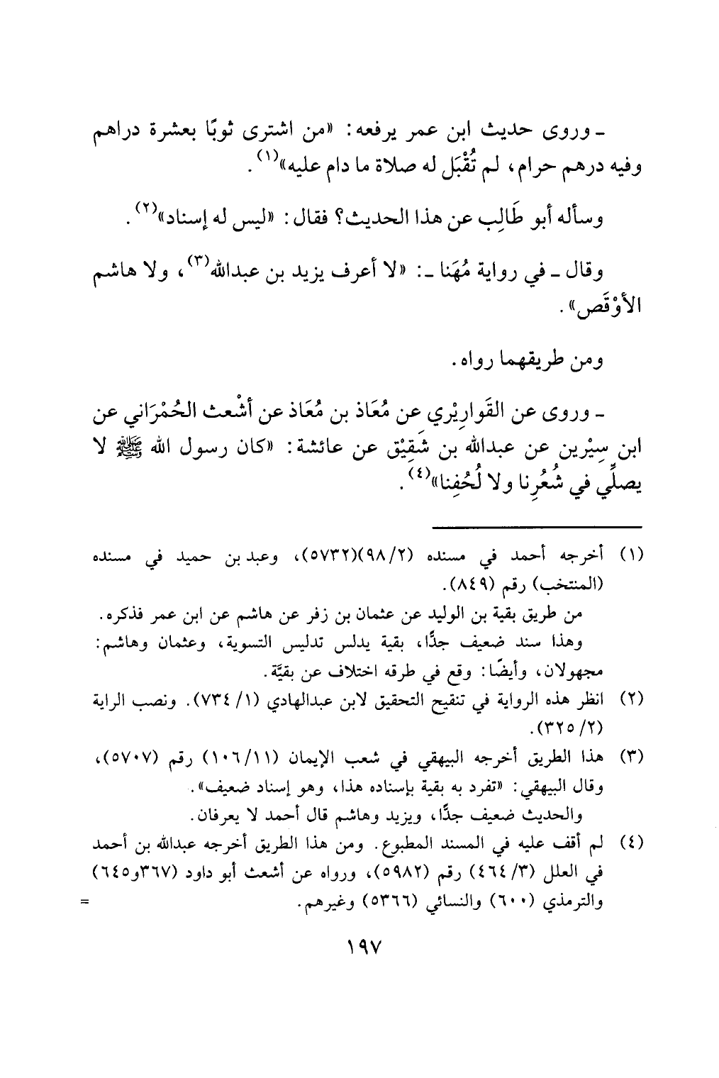 - وروى حديث ابن عمر يرفعه: "من اشترى ثوبًا بعشرة دراهم وفيه درهم حرام، لم تُقْبَل له صلاة ما دام عليه" (¬1).