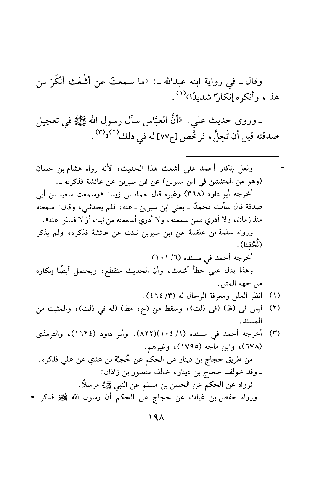 = ولعل إنكار أحمد على أشعث هذا الحديث، لأنه رواه هشام بن حسان (وهو من المتثبتين في ابن سيرين) عن ابن سيرين عن عائشة فذكرته -.