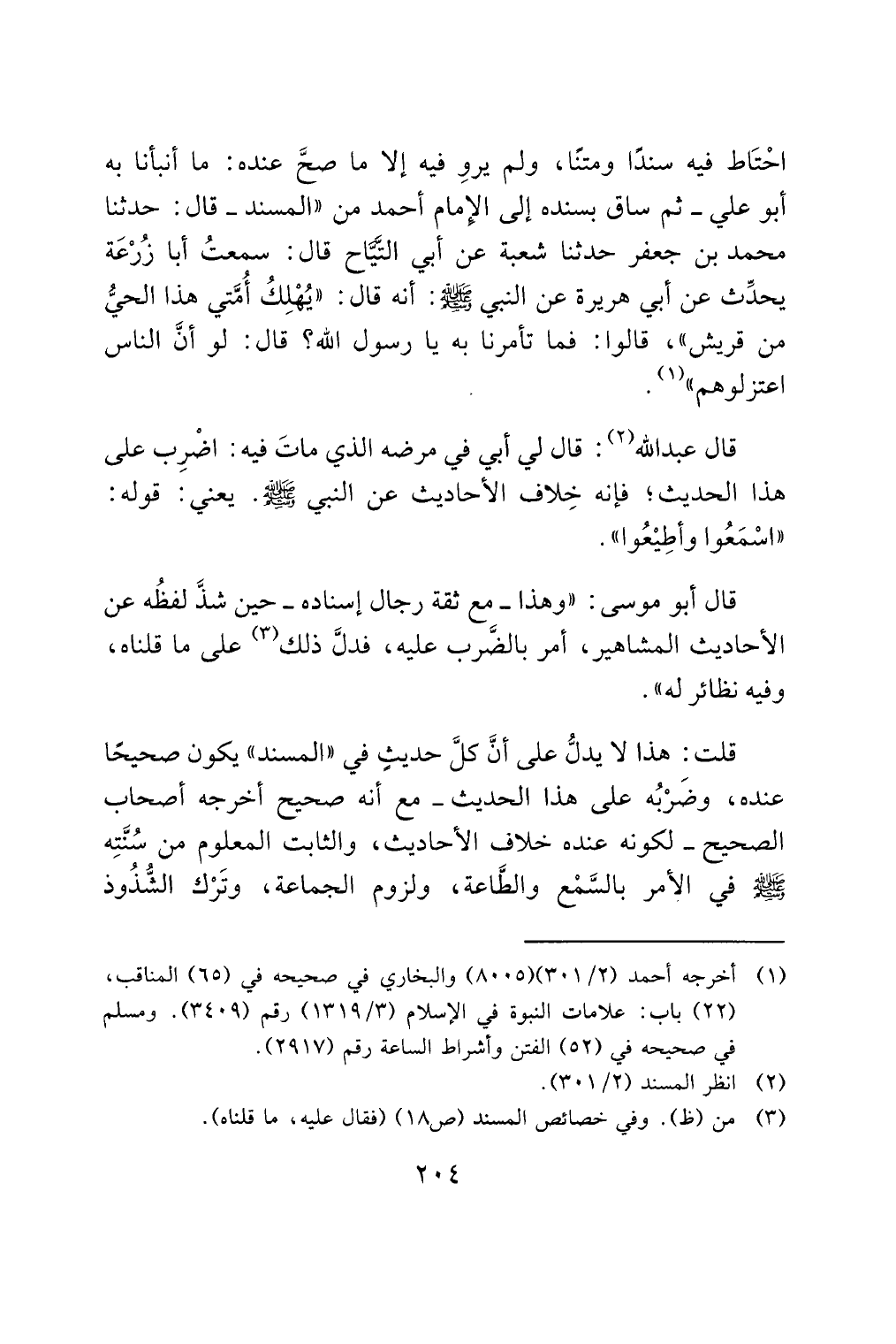 احْتَاط فيه سندًا ومتنًا، ولم يروِ فيه إلا ما صحَّ عنده: ما أنبأنا به أبو علي - ثم ساق بسنده إلى الإِمام أحمد من "المسند - قال: حدثنا محمد بن جعفر حدثنا شعبة عن أبي التَّيَّاح قال: سمعتُ أبا زُرْعَة يحدِّث عن أبي هريرة عن النبي - صلى الله عليه وسلم -: أنه قال: "يُهْلِكُ أُمَّتي هذا الحيُّ من قريش"، قالوا: فما تأمرنا به يا رسول الله؟ قال: لو أنَّ الناس اعتزلوهم" (¬1).