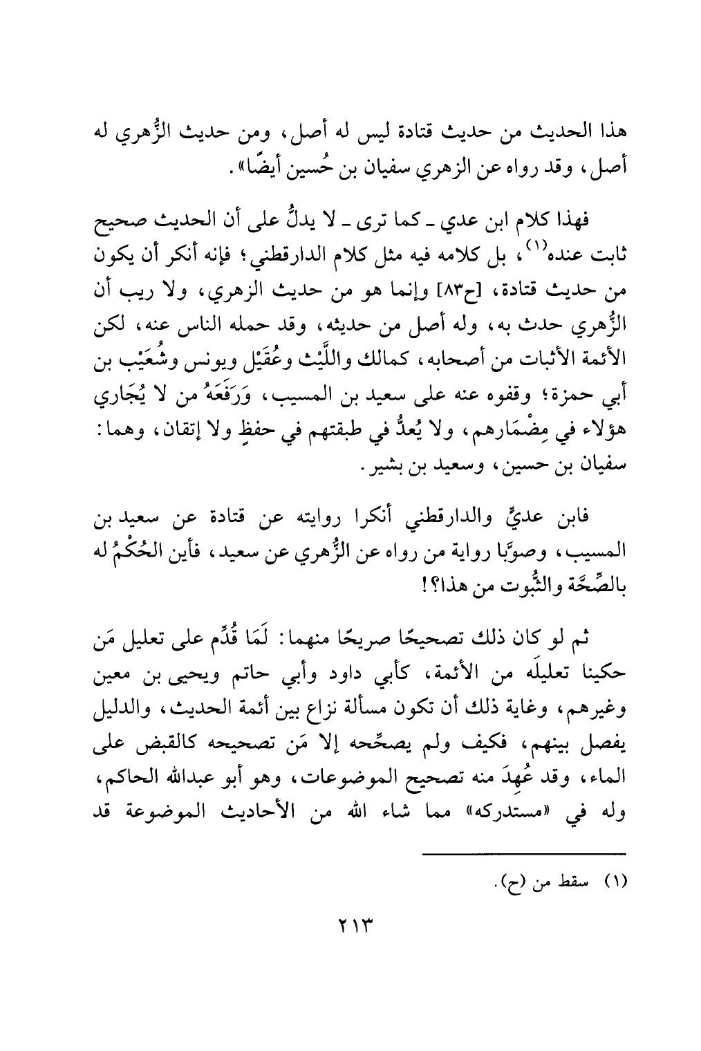 فهذا كلام ابن عدي - كما ترى - لا يدلُّ على أن الحديث صحيح ثابت عنده (¬1)، بل كلامه فيه مثل كلام الدارقطني؛ فإنه أنكر أن يكون من حديث قتادة، [ح 83] وإنما هو من حديث الزهري، ولا ريب أن الزُّهري حدث به، وله أصل من حديثه، وقد حمله الناس عنه، لكن الأئمة الأثبات من أصحابه، كمالك واللَّيْث وعُقَيْل ويونس وشُعَيْب بن أبي حمزة؛ وقفوه عنه على سعيد بن المسيب، وَرَفَعَهُ من لا يُجَاري هؤلاء في مِضْمَارهم، ولا يُعدُّ في طبقتهم في حفظٍ ولا إتقان، وهما: سفيان بن حسين، وسعيد بن بشير.