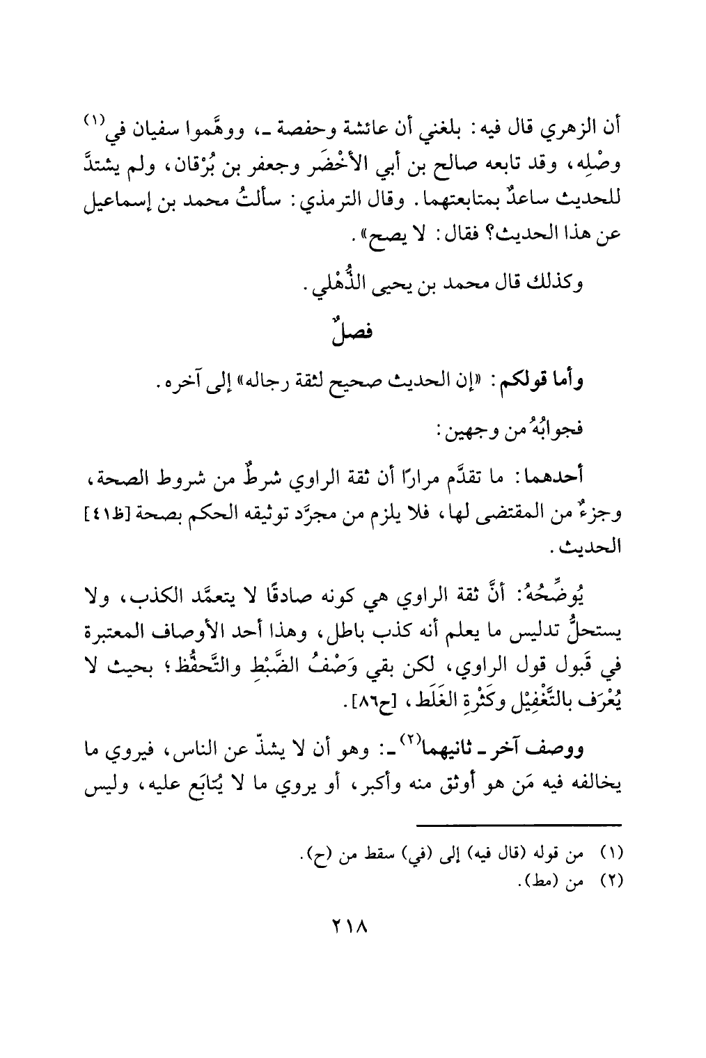 أحدهما: ما تقدَّم مرارًا أن ثقة الراوي شرطٌ من شروط الصحة، وجزءٌ من المقتضى لها، فلا يلزم من مجرَّد توثيقه الحكم بصحة [ظ 41] الحديث.