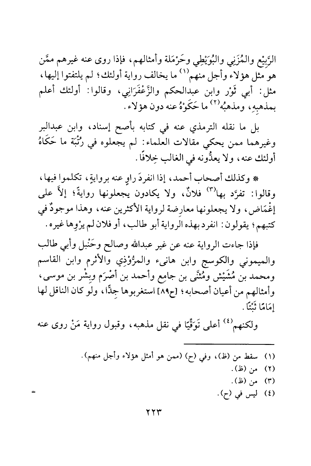 فإذا جاءت الرواية عنه عن غير عبد الله وصالح وحَنْبل وأبي طالب والميموني والكوسج وابن هانئ والمرُّوْذِي والأثرم وابن القاسم ومحمد بن مُشَيْش ومُثنَّى بن جامِع وأحمد بن أصْرَم وبِشْر بن موسى، وأمثالهم من أعيان أصحابه؛ [ح 89] استغربوها جِدًّا، ولو كان الناقل لها إمَامًا ثَبْتًا.