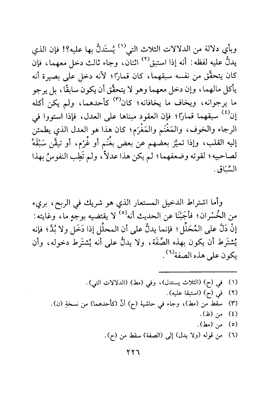 وبأي دلالة من الدلالات الثلاث التي (¬1) يُستَدلُّ بها عليه؟! فإن الذي يدلُّ عليه لفظه: أنه إذا استبق (¬2) اثنان، وجاء ثالث دخل معهما، فإن كان يتحقَّق من نفسه سبقهما، كان قمارًا؛ لأنه دخل على بصيرة أنه يأكل مالهما، وإن دخل معهما وهو لا يتحقَّق أن يكون سابقًا، بل يرجو ما يرجوانه، ويخاف ما يخافانه؛ كان (¬3) كأحدهما، ولم يكن أكله إن (¬4) سبقهما قمارًا؛ فإن العقود مبناها على العدل، فإذا استووا في الرجاء والخوف، والمَغْنَم والمَغْرَم؛ كان هذا هو العدل الذي يطمئن إليه القلب، وإذا تميَّز بعضهم عن بعض بغُنْم أو غُرْم، أو تيقَّن سَبْقَهُ لصاحبيه؛ لقوته وضعفهما؛ لم يكن هذا عدلًا، ولم تَطِب النفوسُ بهذا السِّبَاق.