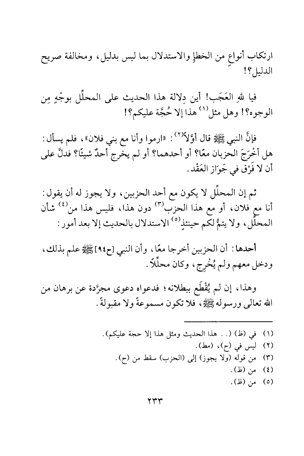 ثم إن المحلِّل لا يكون مع أحد الحزبين، ولا يجوز له أن يقول: أنا مع فلان، أو مع هذا الحزب (¬3) دون هذا، فليس هذا من (¬4) شأن المحلِّل، ولا يتمُّ لكم حينئذٍ (¬5) الاستدلال بالحديث إلا بعد أمور: