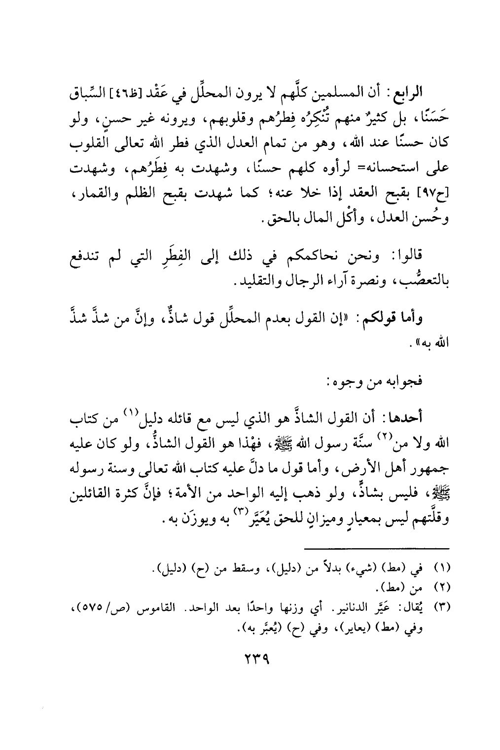 وأما قولكم: "إن القول بعدم المحلِّل قول شاذٌّ، وإنَّ من شذَّ شذَّ الله به".