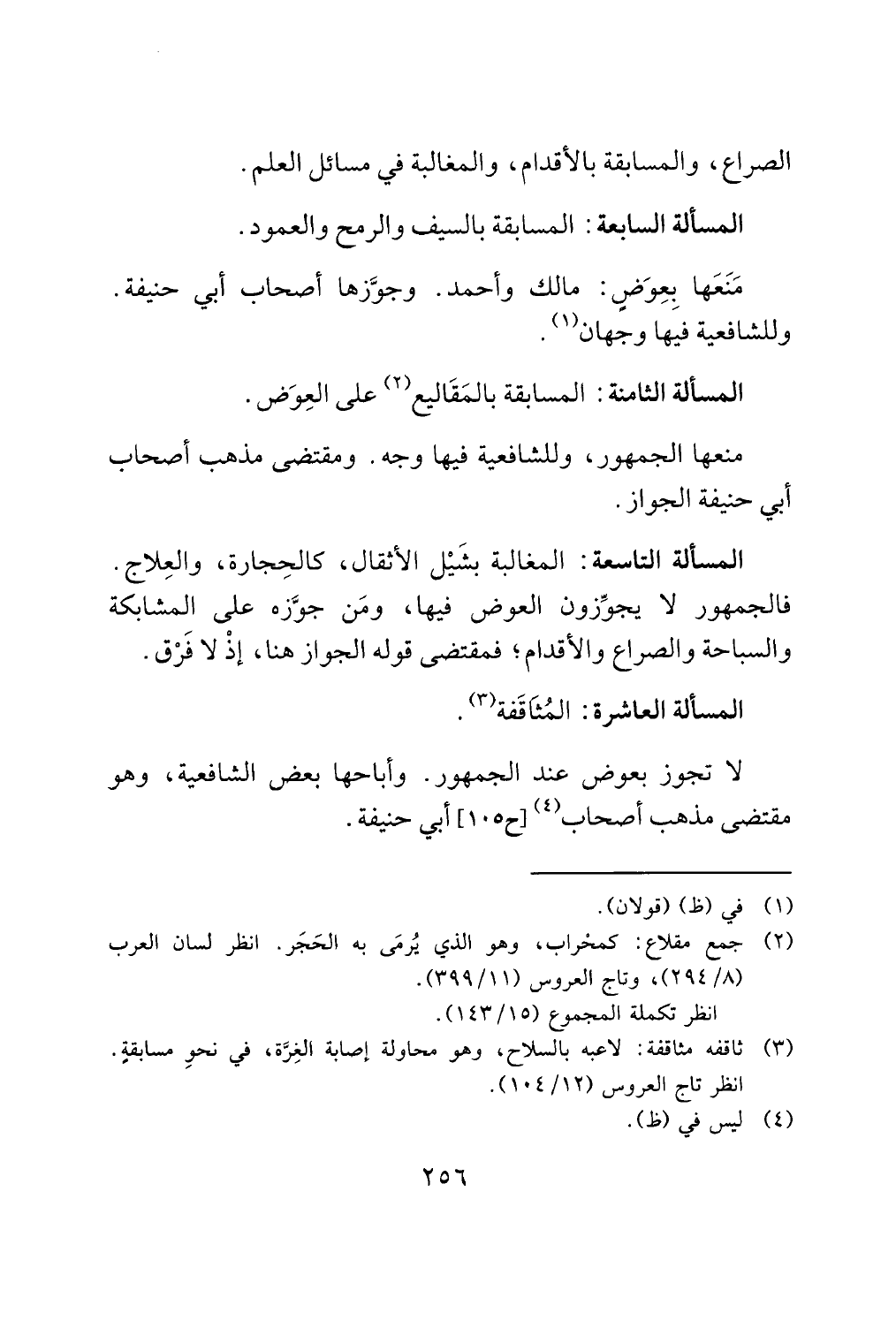 المسألة التاسعة: المغالبة بشَيْل الأثقال، كالحِجارة، والعِلاج. فالجمهور لا يجوِّزون العوض فيها، ومَن جوَّزه على المشابكة والسباحة والصراع والأقدام؛ فمقتضى قوله الجواز هنا، إذْ لا فَرْق.