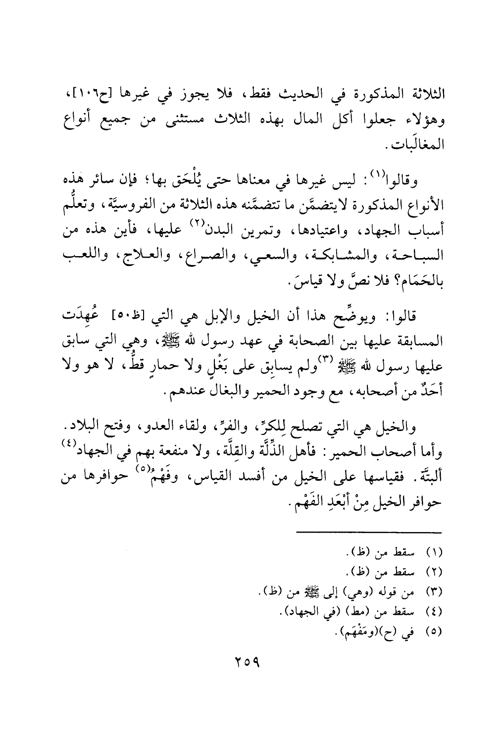 الثلاثة المذكورة في الحديث فقط، فلا يجوز في غيرها [ح 106]، وهؤلاء جعلوا أكل المال بهذه الثلاث مستثنى من جميع أنواع المغالَبات.