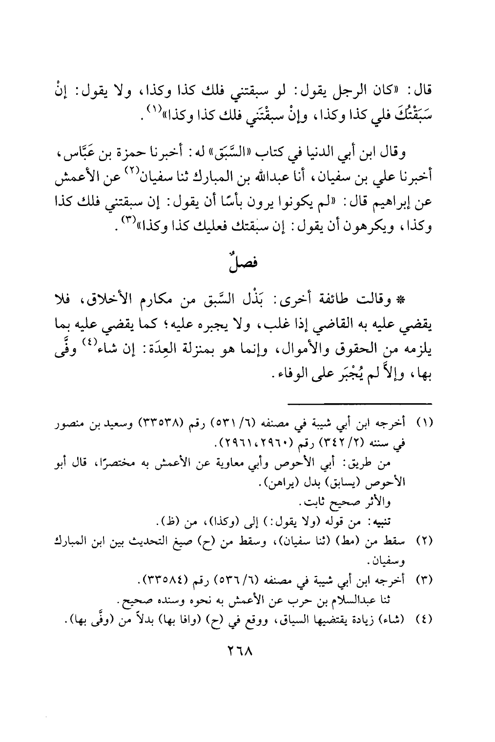 وقال ابن أبي الدنيا في كتاب "السَّبَق" له: أخبرنا حمزة بن عَبَّاس، أخبرنا علي بن سفيان، أنا عبد الله بن المبارك ثنا سفيان (¬2) عن الأعمش عن إبراهيم قال: "لم يكونوا يرون بأسًا أن يقول: إن سبقتني فلك كذا وكذا، ويكرهون أن يقول: إن سبقتك فعليك كذا وكذا" (¬3).