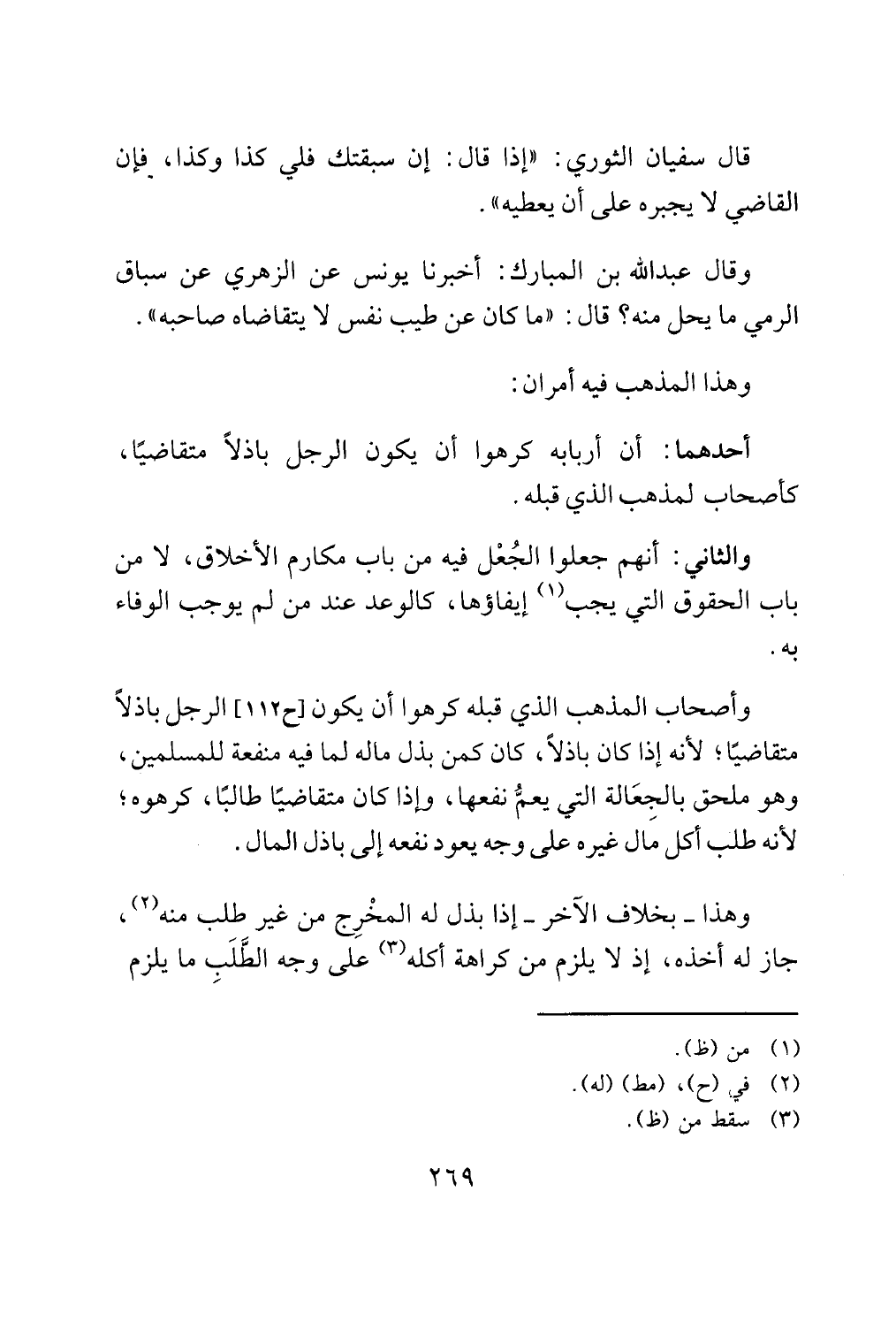 وأصحاب المذهب الذي قبله كرهوا أن يكون [ح 112] الرجل باذلًا متقاضيًا؛ لأنه إذا كان باذلًا، كان كمن بذل ماله لما فيه منفعة للمسلمين، وهو ملحق بالجِعَالة التي يعمُّ نفعها، وإذا كان متقاضيًا طالبًا، كرهوه؛ لأنه طلب أكل مال غيره على وجه يعود نفعه إلى باذل المال.