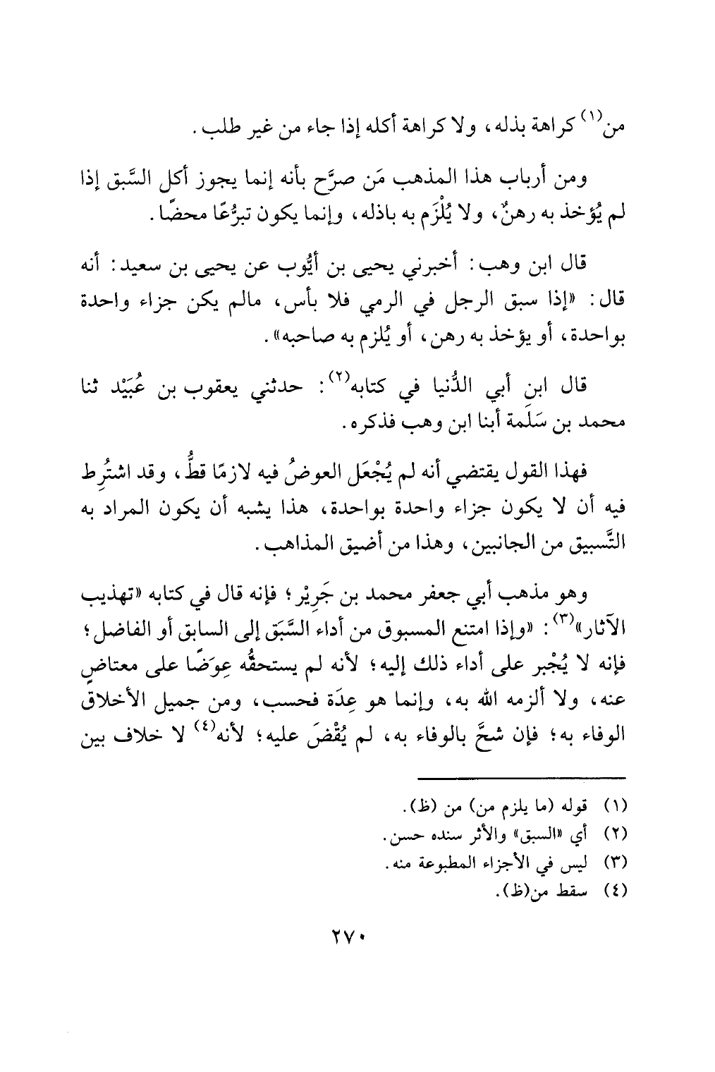وهو مذهب أبي جعفر محمد بن جَرِيْر؛ فإنه قال في كتابه "تهذيب الآثار" (¬3): "وإذا امتنع المسبوق من أداء السَّبَق إلى السابق أو الفاضل؛ فإنه لا يُجْبر على أداء ذلك إليه؛ لأنه لم يستحقُّه عِوَضًا على معتاضٍ عنه، ولا ألزمه الله به، وإنما هو عِدَة فحسب، ومن جميل الأخلاق الوفاء به؛ فإن شحَّ بالوفاء به، لم يُقْضَ عليه؛ لأنه (¬4) لا خلاف بين