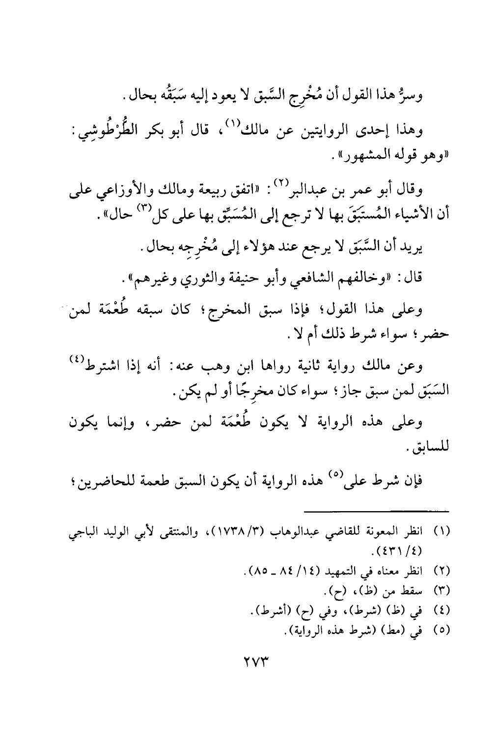 وقال أبو عمر بن عبد البر (¬2): "اتفق ربيعة ومالك والأوزاعي على أن الأشياء المُستَبَقَ بها لا ترجع إلى المُسَبِّق بها على كل (¬3) حال".