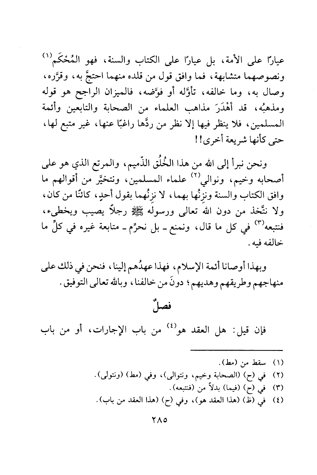 ونحن نبرأ إلى الله من هذا الخُلُق الذّميم، والمرتع الذي هو على أصحابه وخيم، ونوالي (¬2) علماء المسلمين، ونتخيَّر من أقوالهم ما وافق الكتاب والسنة ونزِنُها بهما، لا نزِنُهما بقول أحدٍ، كائنًا من كان، ولا نتَّخذ من دون الله تعالى ورسوله - صلى الله عليه وسلم - رجلًا يصيب ويخطئ، فنتبعه (¬3) في كل ما قال، ونمنع - بل نحرِّم - متابعة غيره في كلِّ ما خالفه فيه.
