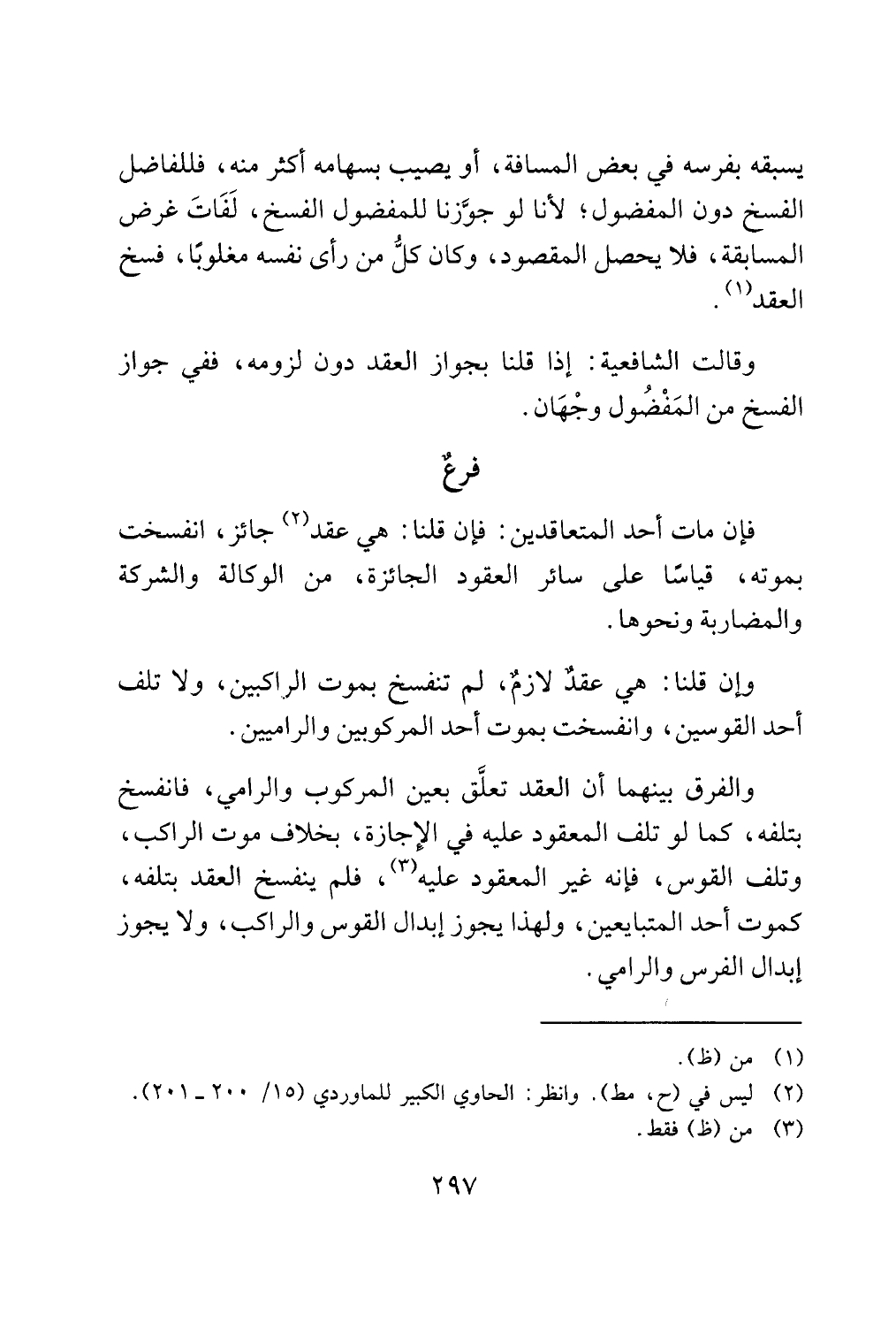 يسبقه بفرسه في بعض المسافة، أو يصيب بسهامه أكثر منه، فللفاضل الفسخ دون المفضول؛ لأنا لو جوَّزنا للمفضول الفسخ، لَفَاتَ غرض المسابقة، فلا يحصل المقصود، وكان كلُّ من رأى نفسه مغلوبًا، فسخ العقد (¬1).