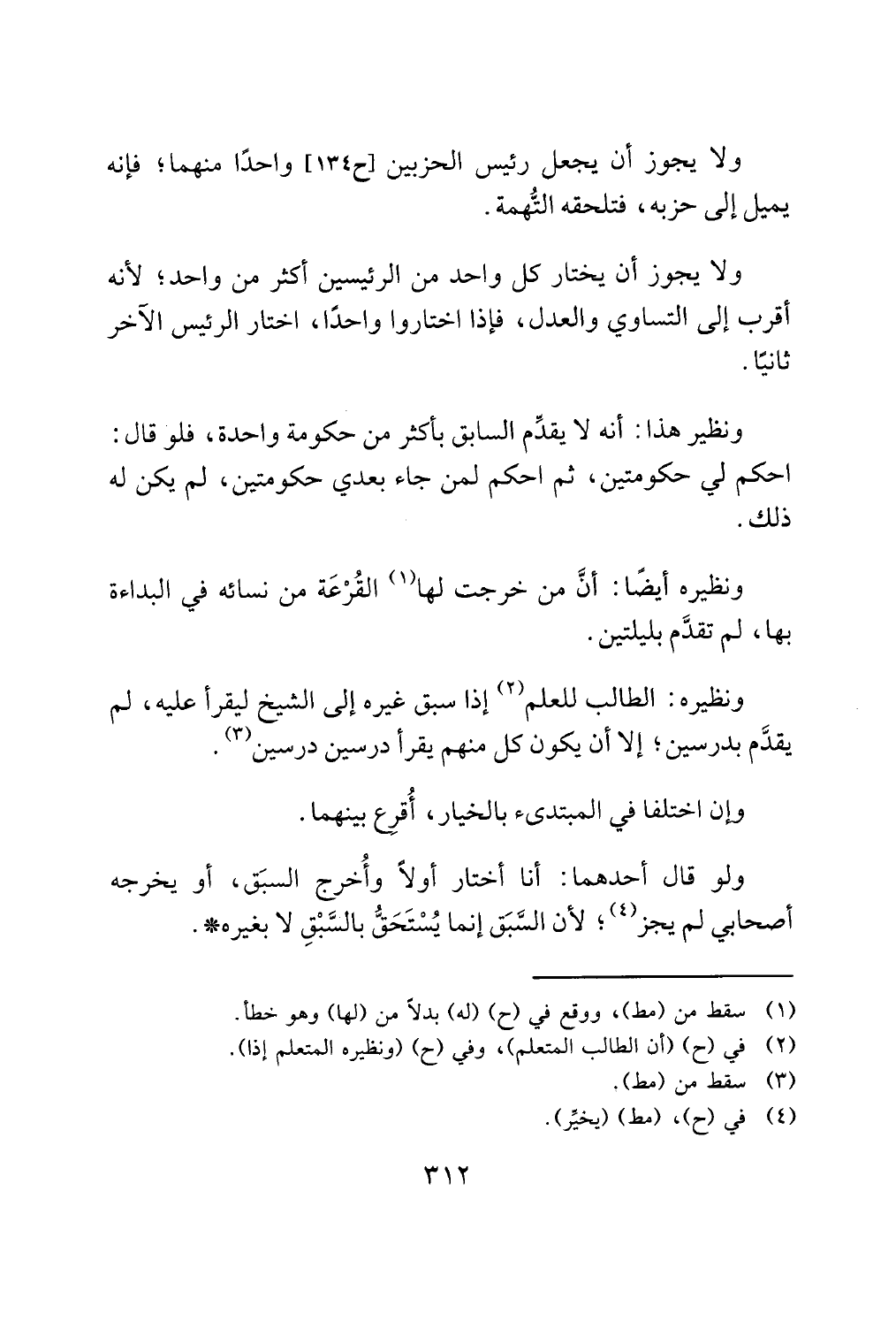 ونظيره: الطالب للعلم (¬2) إذا سبق غيره إلى الشيخ ليقرأ عليه، لم يقدَّم بدرسين؛ إلا أن يكون كل منهم يقرأ درسين درسين (¬3).