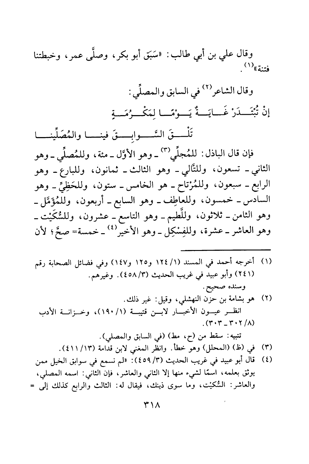 (¬4) قال أبو عبيد في غريب الحديث (3/ 459): "لم نسمع في سوابق الخيل ممن يوثق بعلمه، اسمًا لشيء منها إلا الثاني والعاشر، فإن الثاني: اسمه المصلي، والعاشر: السُّكيْت، وما سوى ذينك، فيقال له: الثالث والرابع كذلك إلى =