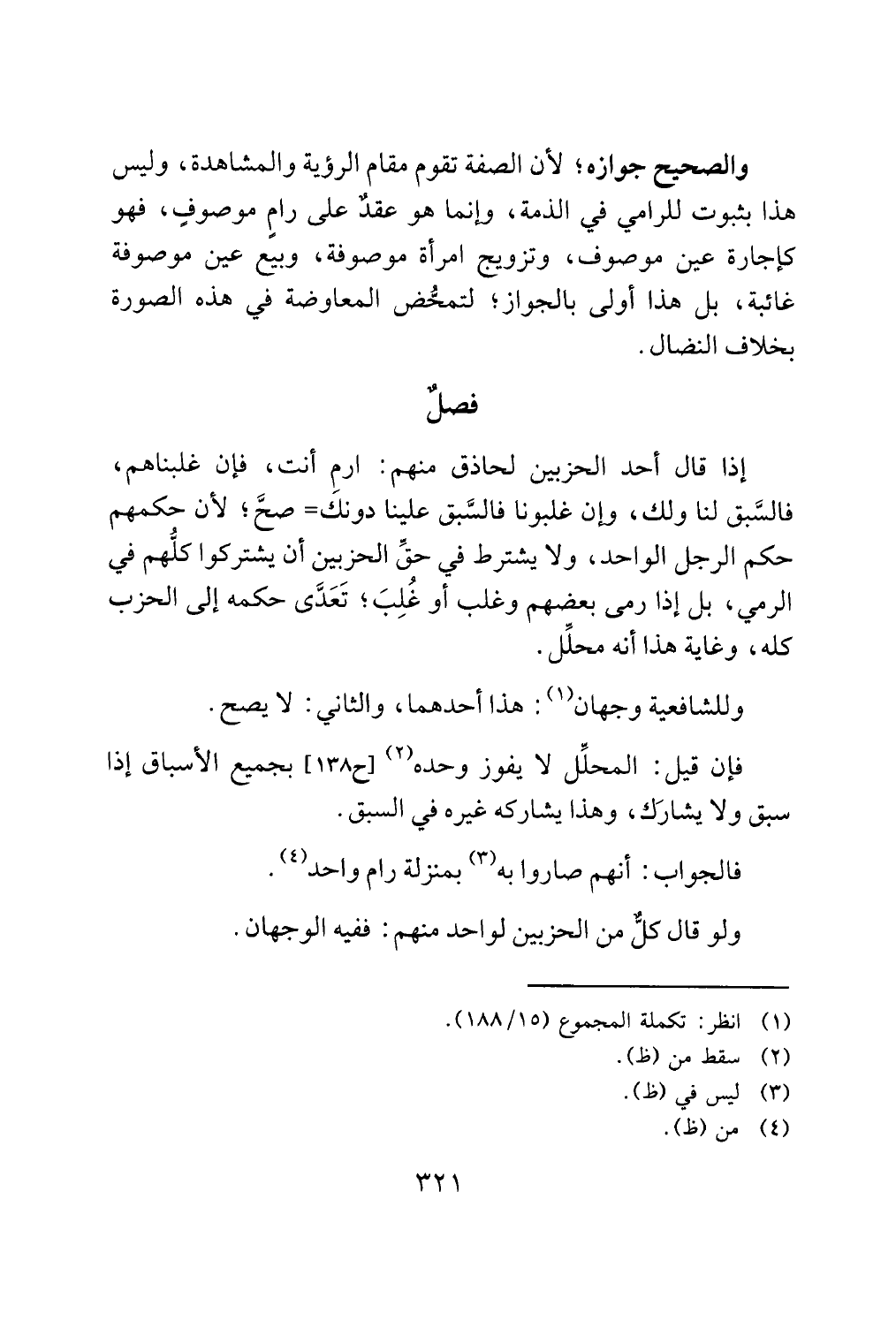 إذا قال أحد الحزبين لحاذق منهم: ارمِ أنت، فإن غلبناهم، فالسَّبق لنا ولك، وإن غلبونا فالسَّبق علينا دونك = صحَّ؛ لأن حكمهم حكم الرجل الواحد، ولا يشترط في حقَّ الحزبين أن يشتركوا كلُّهم في الرمي، بل إذا رمى بعضهم وغلب أو غُلِبَ؛ تَعَدَّى حكمه إلى الحزب كله، وغاية هذا أنه محلِّل.