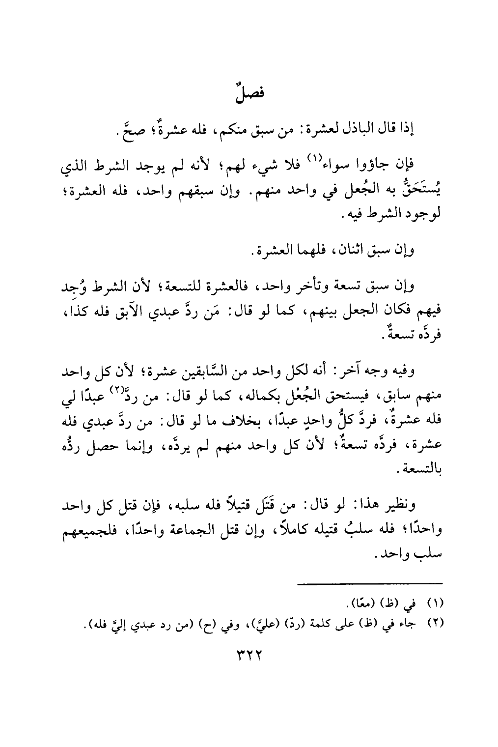 وفيه وجه آخر: أنه لكل واحد من السَّابقين عشرة؛ لأن كل واحد منهم سابق، فيستحق الجُعْل بكماله، كما لو قال: من ردَّ (¬2) عبدًا لي فله عشرةٌ، فردَّ كلُّ واحدٍ عبدًا، بخلاف ما لو قال: من ردَّ عبدي فله عشرة، فردَّه تسعةٌ؛ لأن كل واحد منهم لم يردَّه، وإنما حصل ردُّه بالتسعة.