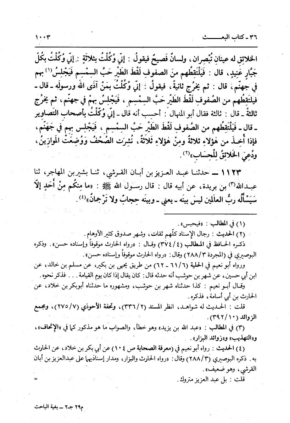 1123 - حَدَّثَنَا عَبْدُ الْعَزِيزِ بْنُ أَبَانَ الْقُرَشِيُّ , ثنا بَشِيرُ بْنُ الْمُهَاجِرِ , ثنا عَبْدُ اللَّهِ بْنُ بُرَيْدَةَ , عَنْ أَبِيهِ , قَالَ: قَالَ رَسُولُ اللَّهِ صَلَّى اللهُ عَلَيْهِ وَسَلَّمَ: «§مَا مِنْكُمْ مِنْ أَحَدٍ إِلَّا سَيَسْأَلُهُ رَبُّ الْعَالَمِينَ لَيْسَ بَيْنَهُ يَعْنِي وَبَيْنَهُ حِجَابٌ وَلَا تُرْجُمَانٌ»