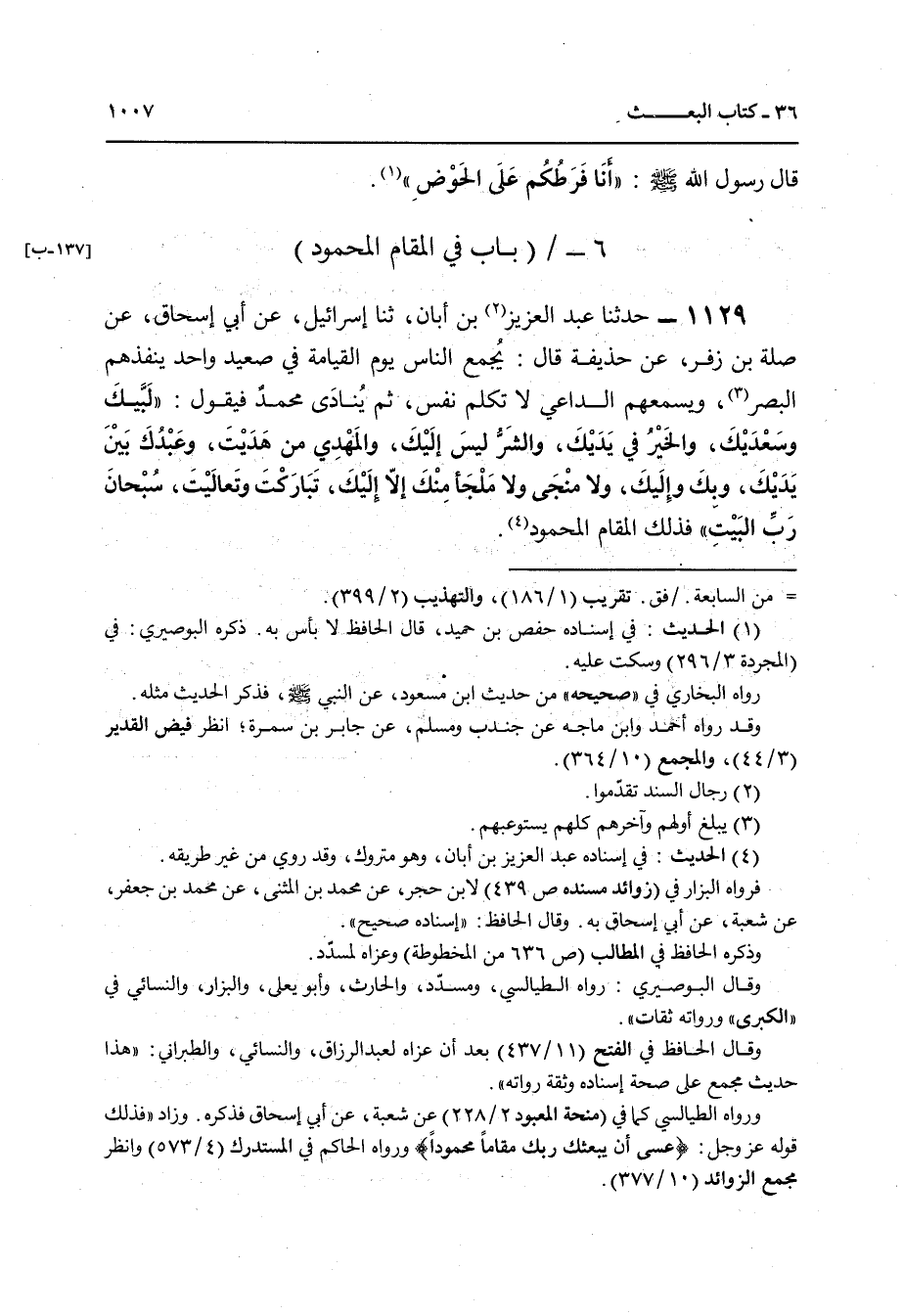 1129 - حَدَّثَنَا عَبْدُ الْعَزِيزِ بْنُ أَبَانَ , ثنا إِسْرَائِيلُ , عَنْ أَبِي إِسْحَاقَ , عَنْ صِلَةَ بْنِ زُفَرَ , عَنْ حُذَيْفَةَ قَالَ: " §يُجْمَعُ النَّاسُ يَوْمَ الْقِيَامَةِ فِي صَعِيدٍ وَاحِدٍ يَنْفُذُهُمُ الْبَصَرُ وَيُسْمِعُهُمُ الدَّاعِي، لَا تَكَلَّمُ نَفْسٌ، ثُمَّ يُنَادِي: مُحَمَّدُ، فَيَقُولُ: لَبَّيْكَ وَسَعْدَيْكَ، وَالْخَيْرُ فِي يَدَيْكَ، وَالشَّرُّ لَيْسَ إِلَيْكَ، وَالْمَهْدِيُّ مَنْ هَدَيْتَ، وَعَبْدُكَ بَيْنَ يَدَيْكَ، وَبِكَ وَإِلَيْكَ، وَلَا مَنْجَى وَلَا مَلْجَأَ مِنْكَ إِلَّا إِلَيْكَ، تَبَارَكْتَ وَتَعَالَيْتَ، سُبْحَانَ رَبِّ الْبَيْتِ، فَذَلِكَ الْمَقَامُ الْمَحْمُودُ "