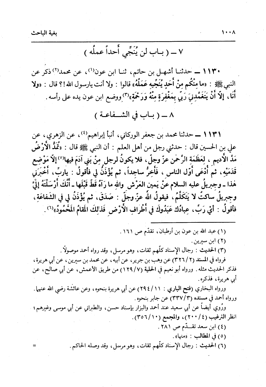 1130 - حَدَّثَنَا أَشْهَلُ بْنُ حَاتِمٍ , ثنا ابْنُ عَوْنٍ , عَنْ مُحَمَّدٍ , ذَكَرَ عَنِ النَّبِيِّ صَلَّى اللهُ عَلَيْهِ وَسَلَّمَ: «§مَا مِنْكُمْ مِنْ أَحَدٍ يُنَجِّيهِ عَمَلُهُ» , قَالُوا: وَلَا أَنْتَ يَا رَسُولَ اللَّهِ قَالَ: «وَلَا أَنَا إِلَّا أَنْ يَتَغَمَّدَنِيَ رَبِّي بِمَغْفِرَةٍ مِنْهُ وَرَحْمَةٍ» , وَوَضَعَ ابْنُ عَوْنٍ يَدَهُ عَلَى رَأْسِهِ