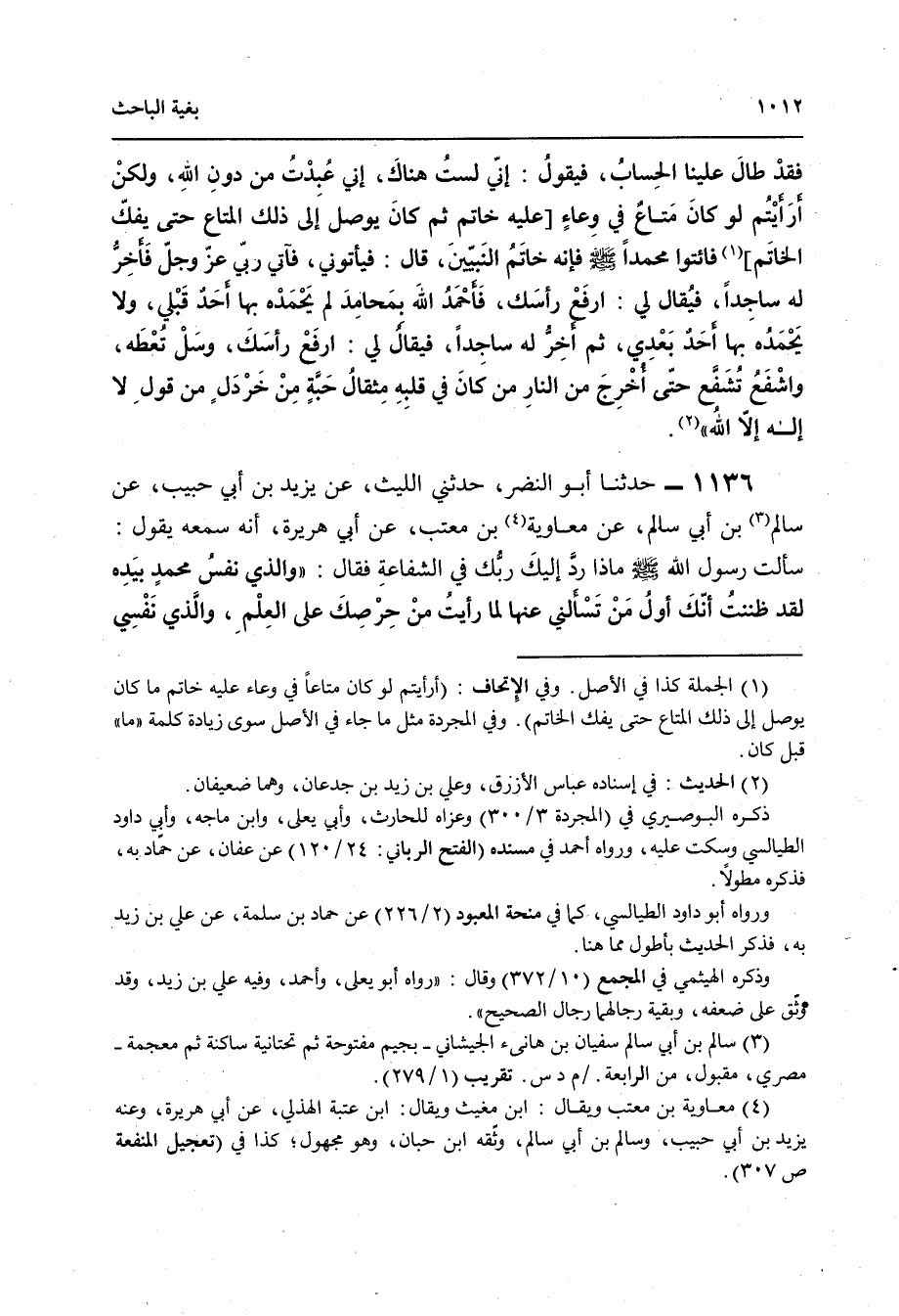 1136 - حَدَّثَنَا أَبُو النَّضْرِ , حَدَّثَنِي اللَّيْثُ , عَنْ يَزِيدَ بْنِ أَبِي حَبِيبٍ , عَنْ سَالِمِ بْنِ أَبِي سَالِمٍ , عَنْ مُعَاوِيَةَ بْنِ مُعَتِّبٍ , عَنْ أَبِي هُرَيْرَةَ , أَنَّهُ سَمِعَهُ يَقُولُ: سَأَلْتُ رَسُولَ اللَّهِ صَلَّى اللهُ عَلَيْهِ وَسَلَّمَ مَاذَا رَدَّ إِلَيْكَ رَبُّكَ فِي الشَّفَاعَةِ؟ فَقَالَ: وَالَّذِي نَفْسُ مُحَمَّدٍ بِيَدِهِ «§لَقَدْ ظَنَنْتُ أَنَّكَ أَوَّلُ مَنْ تَسْأَلُنِي عَنْهَا لِمَا رَأَيْتُ مِنَ حِرْصِكَ عَلَى الْعِلْمِ , وَالَّذِي نَفْسِي بِيَدِهِ لَمَا يُهِمُّنِي مِنَ انْقِصَافِهِمْ عَلَى أَبْوَابِ الْجَنَّةِ أَهَمُّ عِنْدِي مِنْ تَمَامِ شَفَاعَتِي , وَشَفَاعَتِي لِمَنْ شَهِدَ أَنْ لَا إِلَهَ إِلَّا اللَّهُ مُخْلِصًا يُصَدِّقُ قَلْبُهُ لِسَانَهُ وَلِسَانُهُ قَلْبَهُ» , قُلْتُ: فِي الْبُخَارِيِّ مِنْهُ: «وَالَّذِي نَفْسِي بِيَدِهِ لَقَدْ ظَنَنْتُ أَنْ لَا يَسْأَلَنِي عَنْ هَذَا الْحَدِيثِ أَحَدٌ قَبْلَكَ لِمَا رَأَيْتُ مِنَ حِرْصِكَ عَلَى الْحَدِيثِ»