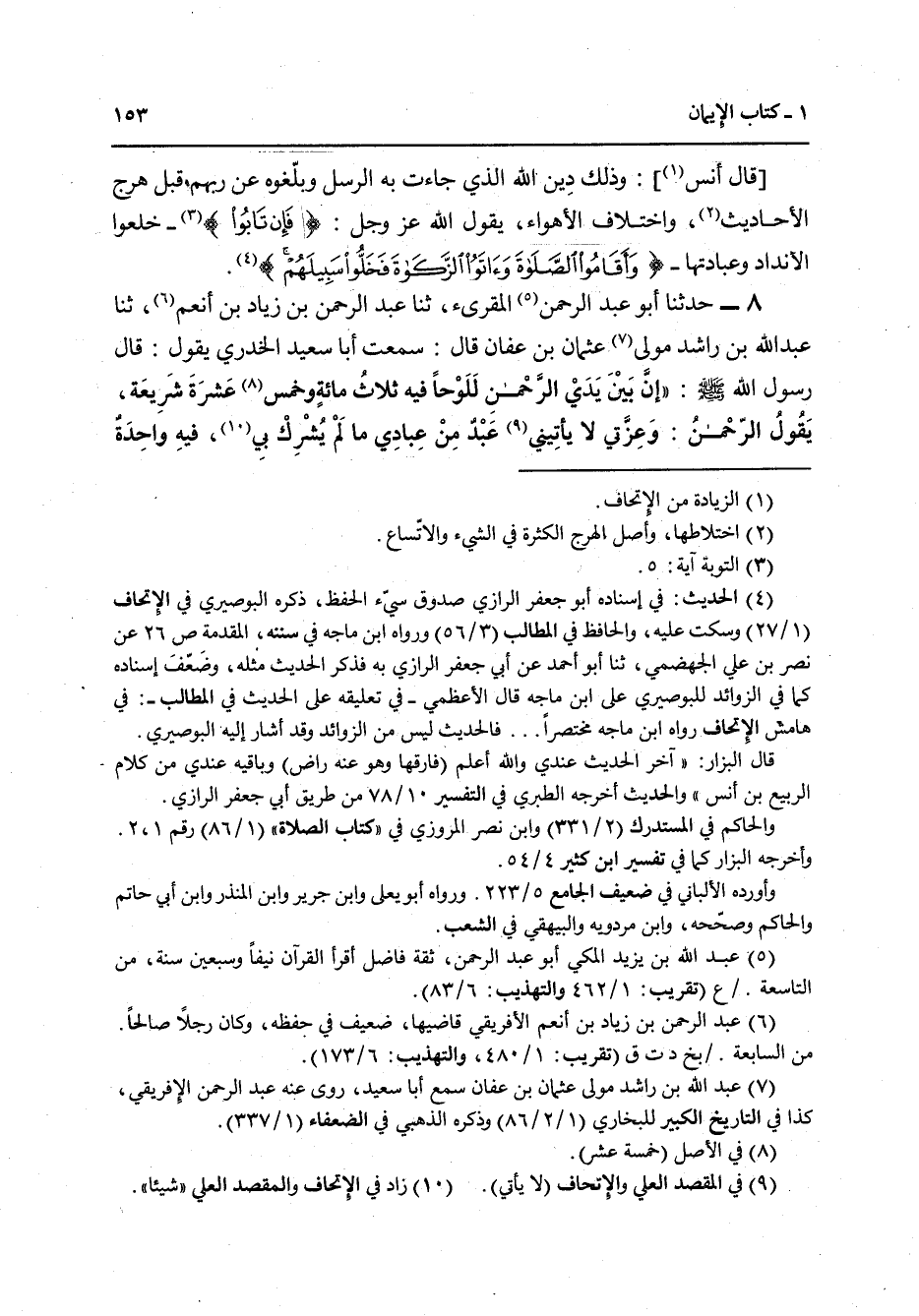 8 - حَدَّثَنَا أَبُو عَبْدِ الرَّحْمَنِ الْمُقْرِئُ، ثنا عَبْدُ الرَّحْمَنِ بْنُ زِيَادِ بْنِ أَنْعُمَ، ثَنَا عَبْدُ اللَّهِ بْنُ رَاشِدٍ مَوْلَى عُثْمَانَ بْنِ عَفَّانَ قَالَ: سَمِعْتُ أَبَا سَعِيدٍ الْخُدْرِيَّ يَقُولُ: قَالَ رَسُولُ اللَّهِ صَلَّى اللهُ عَلَيْهِ وَسَلَّمَ: إِنَّ " §بَيْنَ يَدَيِ الرَّحْمَنِ لَلَوْحًا فِيهِ ثَلَاثُمِائَةٍ وَخَمْسَ عَشْرَةَ شَرِيعَةً , يَقُولُ الرَّحْمَنُ: وَعِزَّتِي لَا يَأْتِينِي عَبْدٌ مِنِ عِبَادِي مَا لَمْ يُشْرِكْ بِي فِيهِ وَاحِدَةٌ مِنْكُنَّ إِلَّا أَدْخَلْتُهُ الْجَنَّةَ "
