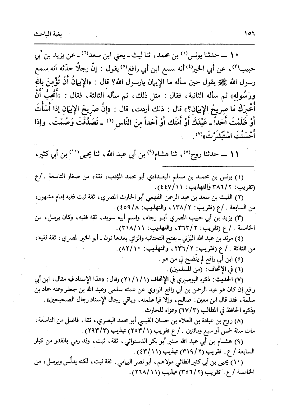 10 - حَدَّثَنَا يُونُسُ بْنُ مُحَمَّدٍ، ثنا لَيْثٌ يَعْنِي ابْنَ سَعْدٍ، عَنْ يَزِيدَ بْنِ أَبِي حَبِيبٍ، عَنْ أَبِي الْخَيْرِ أَنَّهُ سَمِعَ ابْنَ أَبِي رَافِعٍ يَقُولُ إِنَّ رَجُلًا، حَدَّثَهُ أَنَّهُ، سَمِعَ رَسُولَ اللَّهِ صَلَّى اللهُ عَلَيْهِ وَسَلَّمَ يَقُولُ حِينَ سَأَلَهُ مَا الْإِيمَانُ يَا رَسُولَ اللَّهِ قَالَ: «§الْإِيمَانُ أَنَّ تُؤْمِنَ بِاللَّهِ وَرَسُولِهِ» , ثُمَّ سَأَلَهُ الثَّانِيَةَ فَقَالَ مِثْلَ ذَلِكَ , ثُمَّ سَأَلَهُ الثَّالِثَةَ فَقَالَ: «أَتُحِبُّ أَنْ أُخْبِرَكَ مَا صَرِيحُ الْإِيمَانِ؟» قَالَ: ذَلِكَ أَرَدْتُ قَالَ: «إِنَّ صَرِيحَ الْإِيمَانِ إِذَا أَسَأْتَ أَوْ ظَلَمْتَ أَحَدًا عَبْدَكَ أَوْ أَمَتَكَ أَوْ أَحَدًا مِنَ النَّاسِ تَصَدَّقْتَ وَصُمْتَ وَإِذَا أَحْسَنْتَ اسْتَبْشَرْتَ»