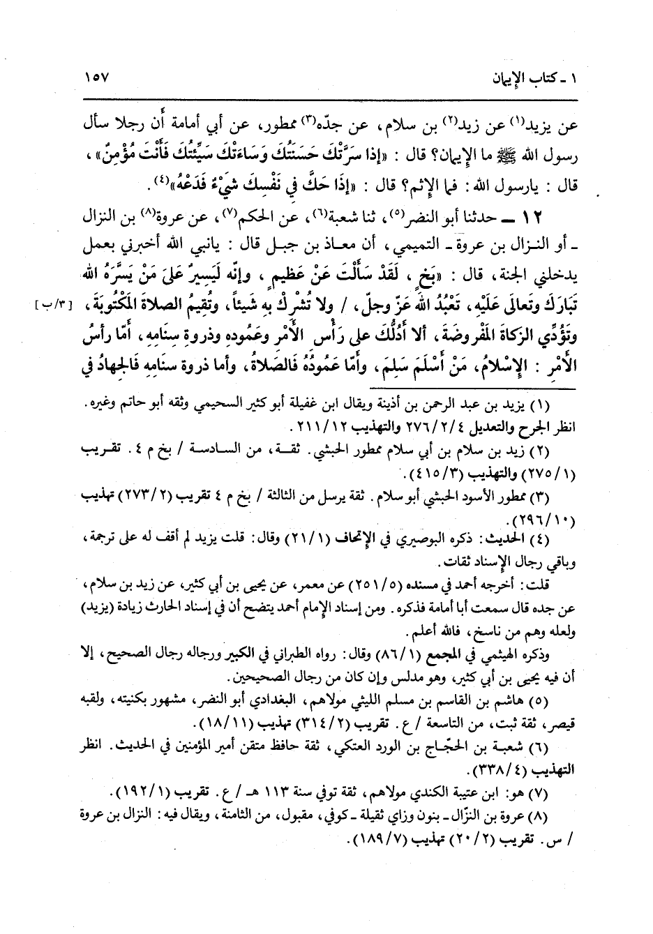 12 - حَدَّثَنَا أَبُو النَّضْرِ، ثنا شُعْبَةُ، عَنِ الْحَكَمِ، عَنْ عُرْوَةَ بْنِ النَّزَّالِ أَوِ النَّزَّالِ بْنِ عُرْوَةَ التَّمِيمِيِّ أَنَّ مُعَاذَ بْنَ جَبَلٍ قَالَ: يَا نَبِيَّ اللَّهِ أَخْبِرْنِي بِعَمَلٍ يُدْخِلُنِي الْجَنَّةَ قَالَ: «§بَخٍ لَقَدْ سَأَلْتَ عَنْ عَظِيمٍ وَإِنَّهُ لَيَسِيرٌ عَلَى مَنْ يَسَّرَهُ اللَّهُ تَبَارَكَ وَتَعَالَى عَلَيْهِ , تَعْبُدُ اللَّهَ عَزَّ وَجَلَّ وَلَا تُشْرِكُ بِهِ شَيْئًا , وَتُقِيمُ الصَّلَاةَ الْمَكْتُوبَةَ , وَتُؤَدِّي الزَّكَاةَ الْمَفْرُوضَةَ , أَلَا أَدُلُّكَ عَلَى رَأْسِ الْأَمْرِ، وَعَمُودِهِ وَذُرْوَةِ سَنَامِهِ؟ , أَمَّا رَأْسُ الْأَمْرِ الْإِسْلَامُ مَنْ أَسْلَمَ سَلِمَ , وَأَمَّا عَمُودُهُ فَالصَّلَاةُ , وَأَمَّا ذِرْوَةُ سَنَامِهِ فَالْجِهَادُ فِي سَبِيلِ اللَّهِ , أَوَلَا أَدُلُّكَ عَلَى أَبْوَابِ الْخَيْرِ؟ الصَّلَاةُ قُرْبَانٌ , وَالصِّيَامُ جُنَّةٌ , وَالصَّدَقَةُ طَهُورٌ , وَقِيَامُ الْعَبْدِ فِي جَوْفِ اللَّيْلِ يُكَفِّرُ الْخَطِيئَةَ» , قَالَ: وَتَلَا رَسُولُ اللَّهِ صَلَّى اللهُ عَلَيْهِ وَسَلَّمَ: {تَتَجَافَى جُنُوبُهُمْ عَنِ الْمَضَاجِعِ يَدْعُونَ رَبَّهُمْ خَوْفًا وَطَمَعًا وَمِمَّا رَزَقْنَاهُمْ يُنْفِقُونَ} [السجدة: 16] , أَلَا أَدُلُّكَ عَلَى أَمْلَكِ ذَلِكَ كُلِّهِ؟ قَالَ: فَأَقْبَلَ رَكْبٌ أَوْ رَاكِبٌ فَأَشَارَ إِلَيَّ رَسُولُ اللَّهِ صَلَّى اللهُ عَلَيْهِ وَسَلَّمَ أَنِ اسْكُتْ , قَالَ: فَلَمَّا مَضَى الرَّكْبُ قُلْتُ: يَا رَسُولَ اللَّهِ وَإِنَّا لَنُؤَاخَذُ بِمَا نَتَكَلَّمُ بِأَلْسِنَتِنَا؟ قَالَ: «ثَكِلَتْكَ أُمُّكَ , وَهَلْ يُكِبُّ النَّاسَ عَلَى مَنَاخِرِهِمْ فِي جَهَنَّمَ إِلَّا حَصَائِدُ أَلْسِنَتِهِمْ» قُلْتُ: عِنْدَ النَّسَائِيِّ طَرَفٌ مِنْهُ