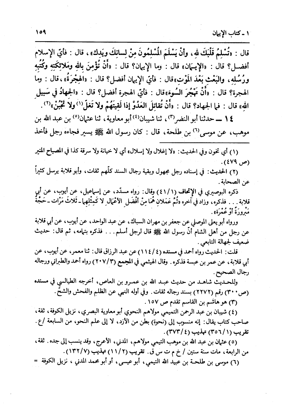 14 - حَدَّثَنَا أَبُو النَّضْرِ، ثنا شَيْبَانُ أَبُو مُعَاوِيَةَ، ثنا عُثْمَانُ بْنُ عَبْدِ اللَّهِ بْنِ مَوْهَبٍ، عَنْ مُوسَى بْنِ طَلْحَةَ قَالَ: كَانَ رَسُولُ اللَّهِ صَلَّى اللهُ عَلَيْهِ وَسَلَّمَ يَسِيرُ فَجَاءَهُ رَجُلٌ فَأَخَذَ بِزِمَامِ نَاقَتِهِ فَقَالَ: يَا نَبِيَّ اللَّهِ أَخْبِرْنِي بِشَيْءٍ يُقَرِّبُنِي مِنَ الْجَنَّةِ وَيُزَحْزِحُنِي عَنِ النَّارِ , قَالَ: «§تُؤْمِنُ بِاللَّهِ وَلَا تُشْرِكُ بِهِ شَيْئًا , وَتُقِيمُ الصَّلَاةَ , وَتُؤْتِي الزَّكَاةَ , وَتَصِلُ الرَّحِمَ» , فَأَرْسَلَ الزِّمَامَ فَقَالَ رَسُولُ اللَّهِ صَلَّى اللهُ عَلَيْهِ وَسَلَّمَ: «إِنْ وَفَّى بِمَا قُلْتُ لَهُ دَخَلَ الْجَنَّةَ»