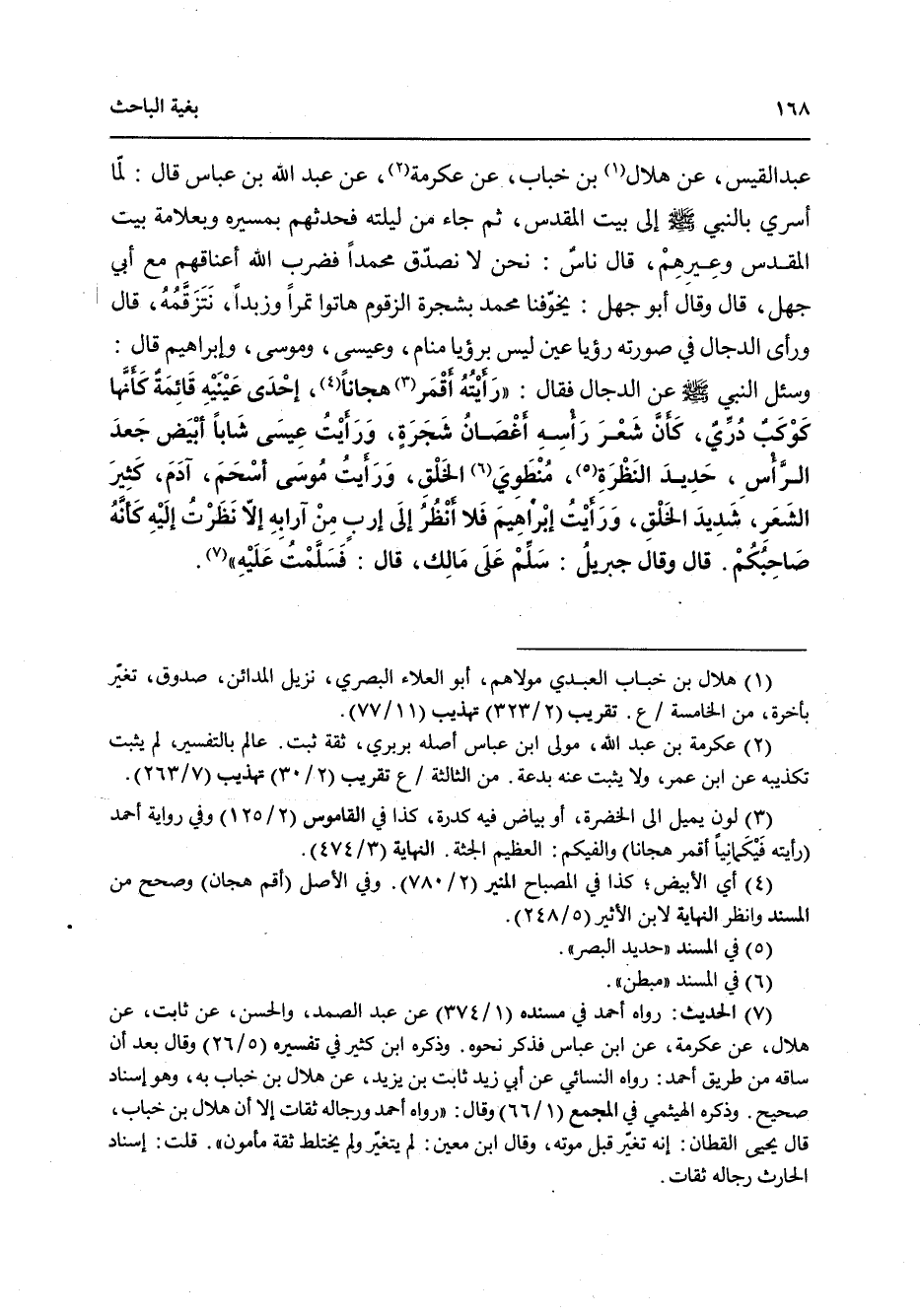 24- حَدَّثنا الْحَسَنُ بْنُ مُوسَى، حَدَّثَنِي ثَابِتُ بْنُ يَزِيدَ, أَبُو زَيْدٍ، مِنْ عَبْدِ الْقَيْسِ, عَنْ هِلاَلِ بْنِ خَبَّابٍ، عَنْ عِكْرِمَةَ، عَنْ عَبْدِ الله بْنِ عَبَّاسٍ قَالَ: لَمَّا أُسْرِيَ بِالنَّبِيِّ صَلى الله عَلَيه وَسَلمَ إِلَى بَيْتِ الْمَقْدِسِ, ثُمَّ جَاءَ مِنْ لَيْلَتِهِ فَحَدَّثَهُمْ بِمَسِيرِهِ وَبِعَلاَمَةِ بَيْتِ الْمَقْدِسِ وَعِيرِهِمْ, قَالَ نَاسٌ: نَحْنُ لاَ نُصَدِّقُ مُحَمَّدًا, فَضَرَبَ الله أَعْنَاقَهُمْ مَعَ أَبِي جَهْلٍ, قَالَ: وَقَالَ أَبُو جَهْلٍ: يُخَوِّفُنَا مُحَمَّدٌ بِشَجَرَةِ الزَّقُّومِ, هَاتُوا تَمْرًا وَزُبْدًا نَتَزَقَّمُهُ, قَالَ: وَرَأَى الدَّجَّالَ فِي صُورَتِهِ رُؤْيَا عَيْنٍ لَيْسَ بِرُؤْيَا مَنَامٍ, وَعِيسَى, وَمُوسَى, وَإِبْرَاهِيمَ قَالَ: وَسُئِلَ النَّبِيُّ صَلى الله عَلَيه وَسَلمَ عَنِ الدَّجَّالِ فَقَالَ: رَأَيْتُهُ أَقْمَرَ هِجَانًا, إِحْدَى عَيْنَيْهِ قَائِمَةٌ, كَأَنَّهَا كَوْكَبٌ دُرِّيٌّ, كَأَنَّ شَعَرَ رَأْسِهِ أَغْصَانُ شَجَرَةٍ, وَرَأَيْتُ عِيسَى شَابًّا أَبْيَضَ جَعْدَ الرَّأْسِ, حَدِيدَ النَّظْرَةِ, مُنْطَوِيَ الْخَلْقِ, وَرَأَيْتُ مُوسَى أَسْحَمَ آدَمَ, كَثِيرَ الشَّعْرِ, شَدِيدَ الْخَلْقِ, وَرَأَيْتُ إِبْرَاهِيمَ فَلاَ أَنْظُرُ إِلَى إِرْبٍ مِنْ آرَابِهِ إِلاَّ نَظَرْتُ إِلَيْهِ كَأَنَّهُ صَاحِبُكُمْ, قَالَ: وَقَالَ جِبْرِيلُ: سَلِّمْ عَلَى مَالِكٍ قَالَ: فَسَلَّمْتُ عَلَيْهِ.