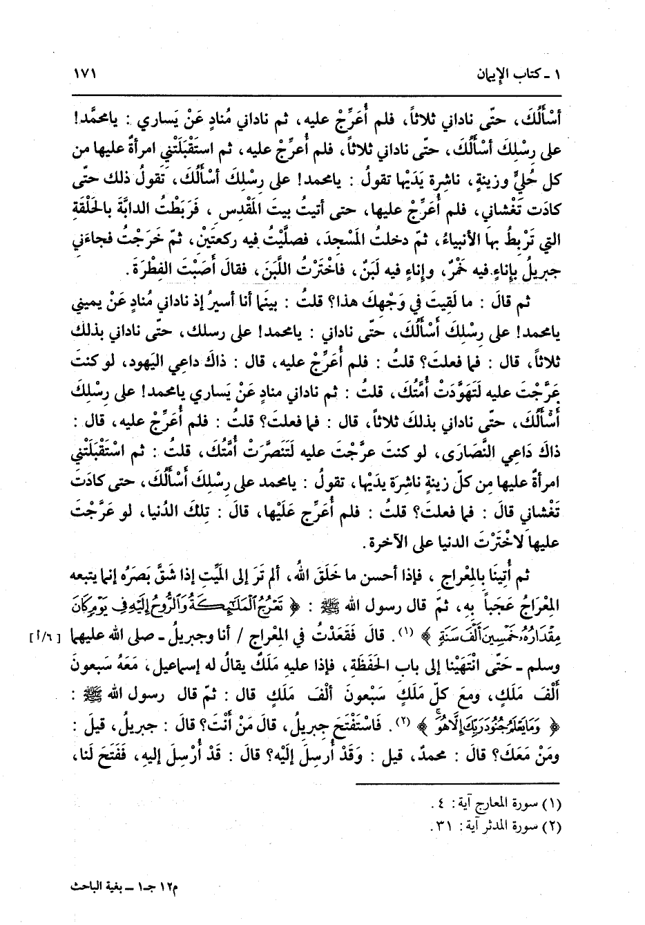 حَتَّى نَادَانِي ثَلاَثًا, فَلَمْ أُعَرِّجْ عَلَيْهِ, ثُمَّ نَادَانِي مُنَادٍ عَنْ يَسَارِي: يَا مُحَمَّدُ, عَلَى رِسْلِكَ أَسْأَلْكَ, حَتَّى نَادَانِي ثَلاَثًا, فَلَمْ أُعَرِّجْ عَلَيْهِ, ثُمَّ اسْتَقْبَلَتْنِي امْرَأَةٌ عَلَيْهَا مِنْ كُلِّ حُلِيٍّ وَزِينَةٍ, نَاشِرَةً يَدَيْهَا تَقُولُ: يَا مُحَمَّدُ, عَلَى رِسْلِكَ أَسْأَلْكَ, تَقُولُ ذَلِكَ حَتَّى كَادَتْ تَغْشَانِي, فَلَمْ أُعَرِّجْ عَلَيْهَا, حَتَّى أَتَيْتُ بَيْتَ الْمَقْدِسِ, فَرَبَطْتُ الدَّابَّةَ بِالْحَلْقَةِ الَّتِي تَرْبِطُ بِهَا الأَنْبِيَاءُ, ثُمَّ دَخَلْتُ الْمَسْجِدَ, فَصَلَّيْتُ فِيهِ رَكْعَتَيْنِ, ثُمَّ خَرَجْتُ فَجَاءَنِي جِبْرِيلُ بِإِنَاءٍ فِيهِ خَمْرٌ وَإِنَّاءٍ فِيهِ لَبَنٌ, فَاخْتَرْتُ اللَّبَنَ, فَقَالَ: أَصَبْتَ الْفِطْرَةَ, ثُمَّ قَالَ: مَا لَقِيتَ فِي وَجْهِكَ هَذَا؟ قُلْتُ: بَيْنَمَا أَنَا أَسِيرُ, إِذْ نَادَانِي مُنَادٍ عَنْ يَمِينِي: يَا مُحَمَّدُ, عَلَى رِسْلِكَ أَسْأَلْكَ, حَتَّى نَادَانِي: يَا مُحَمَّدُ, عَلَى رِسْلِكَ, حَتَّى نَادَانِي بِذَلِكَ ثَلاَثًا, قَالَ: فَمَا فَعَلْتَ؟ قُلْتُ: فَلَمْ أُعَرِّجْ عَلَيْهِ, قَالَ: ذَاكَ دَاعِي الْيَهُودِ, لَوْ كُنْتَ عَرَّجْتَ عَلَيْهِ لَتَهَوَّدَتْ أُمَّتُكَ, قُلْتُ: ثُمَّ نَادَانِي مُنَادٍ عَنْ يَسَارِي: يَا مُحَمَّدُ, عَلَى رِسْلِكَ أَسْأَلْكَ, حَتَّى نَادَانِي بِذَلِكَ ثَلاَثًا, قَالَ: فَمَا فَعَلْتَ؟ قُلْتُ: فَلَمْ أُعَرِّجْ عَلَيْهِ, قَالَ: ذَاكَ دَاعِي النَّصَارَى, لَوْ كُنْتَ عَرَّجْتَ عَلَيْهِ لَتَنَصَّرَتْ أُمَّتُكَ، قُلْتُ: ثُمَّ اسْتَقْبَلَتْنِي امْرَأَةٌ عَلَيْهَا مِنْ كُلِّ زِينَةٍ, نَاشِرَةً يَدَيْهَا تَقُولُ: يَا مُحَمَّدُ, عَلَى رِسْلِكَ أَسْأَلْكَ, حَتَّى كَادَتْ تَغْشَانِي قَالَ: فَمَا فَعَلْتَ؟ قُلْتُ: فَلَمْ أُعَرِّجْ عَلَيْهَا, قَالَ: تِلْكَ الدُّنْيَا, لَوْ عَرَّجْتَ عَلَيْهَا لاَخْتَرْتَ الدُّنْيَا عَلَى الآخِرَةِ, ثُمَّ أُتِينَا بِالْمِعْرَاجِ, فَإِذَا أَحْسَنُ مَا خَلَقَ الله, أَلَمْ تَرَ إِلَى الْمَيِّتِ إِذَا شُقَّ بَصَرُهُ, إِنَّمَا يَتْبَعُهُ الْمِعْرَاجُ عَجَبًا بِهِ، ثُمَّ قَالَ رَسُولُ الله صَلى الله عَلَيه وَسَلمَ: {تَعْرُج الْمَلاَئِكَةُ وَالرُّوحُ إِلَيْهِ فِي يَوْمٍ كَانَ مِقْدَارُهُ خَمْسِينَ أَلْفَ سَنَةٍ} قَالَ: فَقَعَدْتُ فِي الْمِعْرَاجِ أَنَا وَجِبْرِيلُ صَلَّى الله عَلَيْهِمَا وَسَلَّمَ, حَتَّى انْتَهَيْنَا إِلَى بَابِ الْحَفَظَةِ, فَإِذَا عَلَيْهِ مَلَكٌ يُقَالُ لَهُ: إِسْمَاعِيلُ, مَعَهُ سَبْعُونَ أَلْفَ مَلَكٍ, وَمَعَ كُلِّ مَلَكٍ سَبْعُونَ أَلْفَ مَلَكٍ, قَالَ: ثُمَّ قَالَ رَسُولُ الله صَلى الله عَلَيه وَسَلمَ: {وَمَا يَعْلَمُ جُنُودَ رَبِّكَ إِلاَّ هُوَ} فَاسْتَفْتَحَ جِبْرِيلُ, قَالَ: مَنْ أَنْتَ؟ قَالَ: جِبْرِيلُ, قِيلَ: وَمَنْ مَعَكَ؟ قَالَ: مُحَمَّدٌ, قِيلَ: وَقَدْ أُرْسِلَ إِلَيْهِ؟ قَالَ: قَدْ أُرْسِلَ إِلَيْهِ, فَفُتِحَ لَنَا,