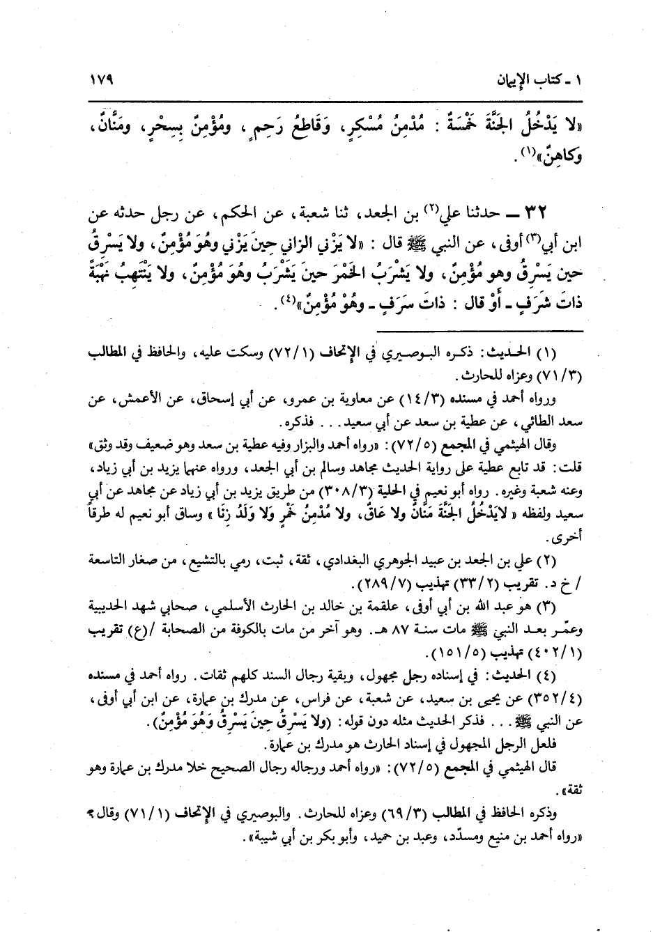 32 - حَدَّثَنَا عَلِيُّ بْنُ الْجَعْدِ، ثنا شُعْبَةُ، عَنِ الْحَكَمِ، عَنْ رَجُلٍ، حَدَّثَهُ عَنِ ابْنِ أَبِي أَوْفَى عَنِ النَّبِيِّ صَلَّى اللهُ عَلَيْهِ وَسَلَّمَ قَالَ: " §لَا يَزْنِي الزَّانِي حِينَ يَزْنِي وَهُوَ مُؤْمِنٌ , وَلَا يَسْرِقُ حِينَ يَسْرِقُ وَهُوَ مُؤْمِنٌ , وَلَا يَشْرَبُ الْخَمْرَ حِينَ يَشْرَبُ وَهُوَ مُؤْمِنٌ , وَلَا يَنْتَهِبُ نُهْبَةً ذَاتَ شَرَفٍ أَوْ قَالَ: ذَاتَ سَرَفٍ وَهُوَ مُؤْمِنٌ "