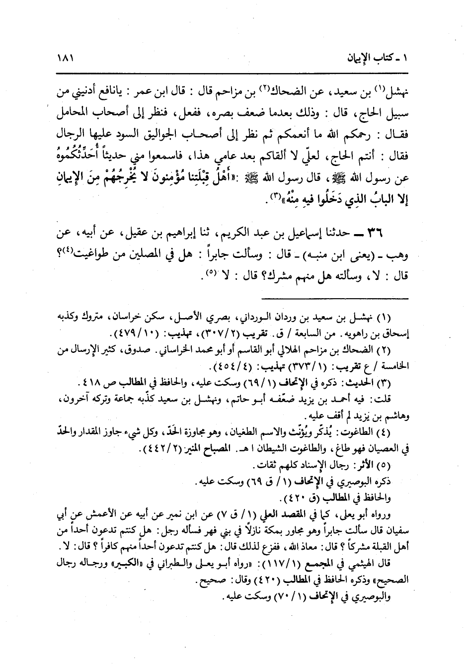 36 - حَدَّثَنَا إِسْمَاعِيلُ بْنُ عَبْدِ الْكَرِيمِ، ثنا إِبْرَاهِيمُ بْنُ عَقِيلٍ، عَنْ أَبِيهِ، عَنْ وَهْبٍ يَعْنِي ابْنَ مُنَبِّهٍ، قَالَ: وَسَأَلْتُ جَابِرًا " §هَلْ فِي الْمُصَلِّينَ مِنْ طَوَاغِيتَ؟ قَالَ: لَا , وَسَأَلْتُهُ هَلْ مِنْهُمْ مُشْرِكٌ قَالَ: لَا "