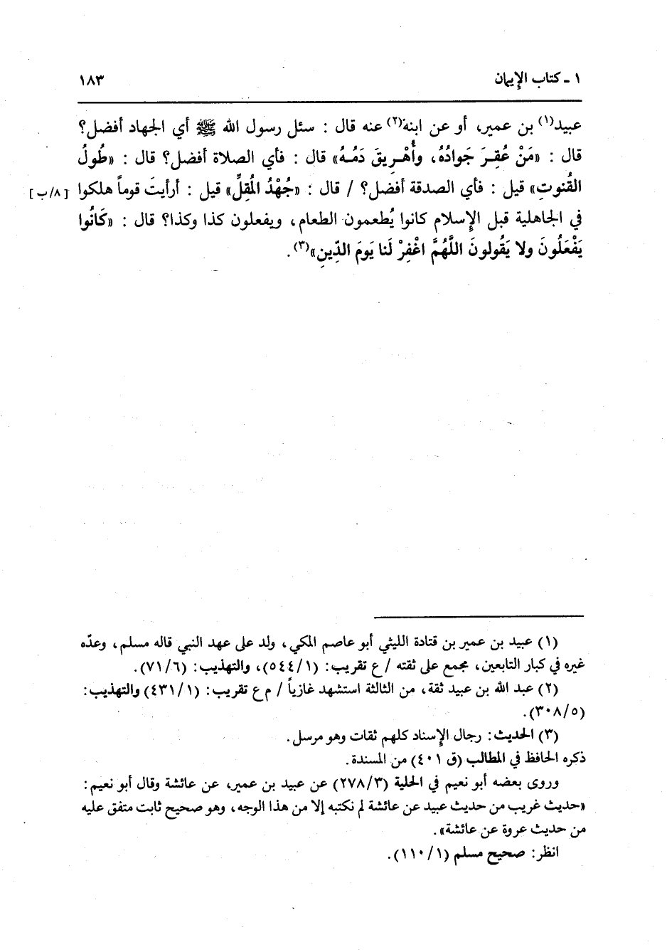 38- حَدَّثنا مُعَاوِيَةُ بْنُ عَمْرٍو، حَدَّثنا أَبُو إِسْحَاقَ، عَنْ هَارُونَ، عَنْ عُبَيْدِ بْنِ عُمَيْرٍ, أَوْ عَنِ ابْنِهِ, عَنْهُ, قَالَ: سُئِلَ رَسُولُ الله صَلى الله عَلَيه وَسَلمَ: أَيُّ الْجِهَادِ أَفْضَلُ؟ قَالَ: مَنْ عُقِرَ جَوَادُهُ, وَأُهْرِيقَ دَمُهُ، قَالَ: فَأَيُّ الصَّلاَةِ أَفْضَلُ؟ قَالَ: طُولُ الْقُنُوتِ, قِيلَ: فَأَيُّ الصَّدَقَةِ أَفْضَلُ؟ قَالَ: جَهْدُ الْمُقِلِّ، قِيلَ: أَرَأَيْتَ قَوْمًا هَلَكُوا فِي الْجَاهِلِيَّةِ قَبْلَ الإِسْلاَمِ كَانُوا يُطْعِمُونَ الطَّعَامَ, وَيَفْعَلُونَ كَذَا وَكَذَا؟ قَالَ: كَانُوا يَفْعَلُونَ وَلاَ يَقُولُونَ: اللهمَّ اغْفِرْ لَنَا يَوْمَ الدِّينِ.