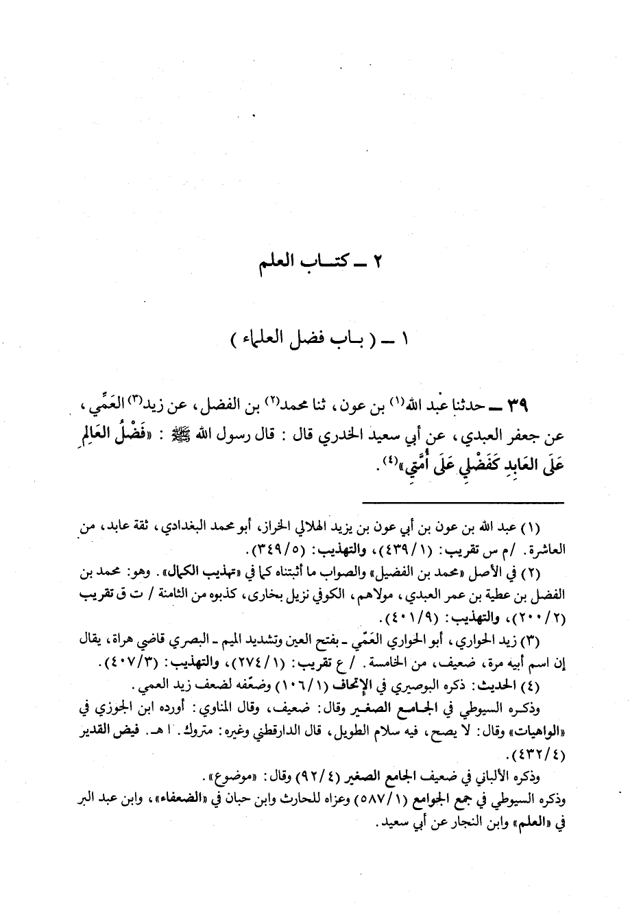 39 - حَدَّثَنَا عَبْدُ اللَّهِ بْنُ عَوْنٍ، ثنا مُحَمَّدُ بْنُ الْفَضْلِ، عَنْ زَيْدٍ الْعَمِّيِّ، عَنْ جَعْفَرٍ الْعَبْدِيِّ عَنْ أَبِي سَعِيدٍ الْخُدْرِيِّ قَالَ: قَالَ رَسُولُ اللَّهِ صَلَّى اللهُ عَلَيْهِ وَسَلَّمَ: «§فَضْلُ الْعَالِمِ عَلَى الْعَابِدِ كَفَضْلِي عَلَى أُمَّتِي» , قُلْتُ: رَوَاهُ غَيْرُ الْحَارِثِ فَقَالَ: «كَفَضْلِي عَلَى أَدْنَاكُمْ»
