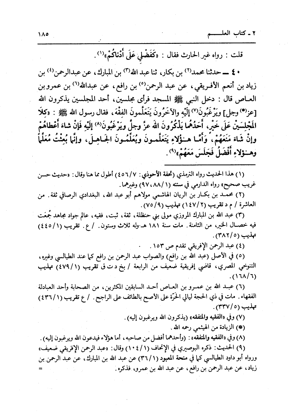 40 - حَدَّثَنَا مُحَمَّدُ بْنُ بَكَّارٍ، ثنا عَبْدُ اللَّهِ بْنُ الْمُبَارَكِ، عَنْ عَبْدِ الرَّحْمَنِ بْنِ زِيَادِ بْنِ أَنْعُمَ الْإِفْرِيقِيِّ، عَنْ عَبْدِ الرَّحْمَنِ بْنِ رَافِعٍ، عَنْ عَبْدِ اللَّهِ بْنِ عَمْرِو بْنِ الْعَاصِ قَالَ: دَخَلَ النَّبِيُّ صَلَّى اللهُ عَلَيْهِ وَسَلَّمَ الْمَسْجِدَ فَرَأَى مَجْلِسَيْنِ , أَحَدُ الْمَجْلِسَيْنِ يَذْكُرُونَ اللَّهَ عَزَّ وَجَلَّ وَيَرْغَبُونَ إِلَيْهِ , وَالْآخَرُونَ يَتَعَلَّمُونَ الْفِقْهَ , فَقَالَ رَسُولُ اللَّهِ صَلَّى اللهُ عَلَيْهِ وَسَلَّمَ: «§كِلَا الْمَجْلِسَيْنِ عَلَى خَيْرٍ , أَحَدُهُمَا يَذْكُرُونَ اللَّهَ عَزَّ وَجَلَّ وَيَرْغَبُونَ إِلَيْهِ فَإِنْ شَاءَ أَعْطَاهُمْ وَإِنْ شَاءَ مَنَعَهُمْ , وَأَمَّا هَؤُلَاءِ يَتَعَلَّمُونَ وَيُعَلِّمُونَ الْجَاهِلَ , وَإِنَّمَا بُعِثْتُ مُعَلِّمًا وَهَؤُلَاءِ أَفْضَلُ فَجَلَسَ مَعَهُمْ»