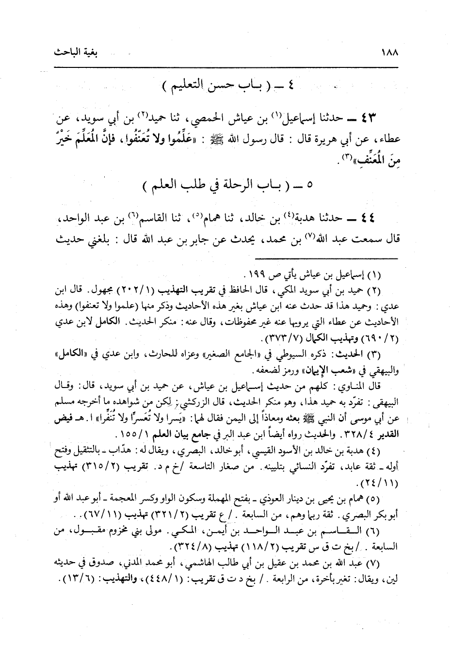 43 - حَدَّثَنَا إِسْمَاعِيلُ بْنُ عَيَّاشٍ الْحِمْصِيُّ، ثنا حُمَيْدُ بْنُ أَبِي سُوَيْدٍ، عَنْ عَطَاءٍ، عَنْ أَبِي هُرَيْرَةَ قَالَ: قَالَ رَسُولُ اللَّهِ صَلَّى اللهُ عَلَيْهِ وَسَلَّمَ: «§عَلِّمُوا وَلَا تُعَنِّفُوا فَإِنَّ الْمُعَلِّمَ خَيْرٌ مِنَ الْمُعَنِّفِ»