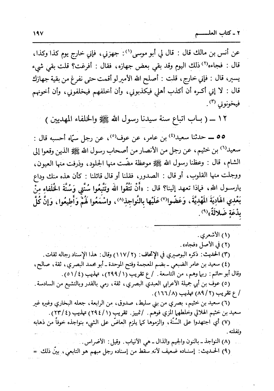 55 - حَدَّثَنَا سَعِيدُ بْنُ عَامِرٍ، عَنْ عَوْفٍ، عَنْ رَجُلٍ، سَمَّاهُ أَحْسِبُهُ قَالَ: سَعِيدُ بْنُ خُثَيْمٍ عَنْ رَجُلٍ، مِنَ الْأَنْصَارِ مِنْ أَصْحَابِ رَسُولِ اللَّهِ صَلَّى اللهُ عَلَيْهِ وَسَلَّمَ الَّذِينَ وَقَعُوا إِلَى الشَّامِ قَالَ: " وَعَظَنَا رَسُولُ اللَّهِ صَلَّى اللهُ عَلَيْهِ وَسَلَّمَ مَوْعِظَةً مَضَتْ مِنْهَا الْجُلُودُ وَذَرَفَتْ مِنْهَا الْعُيُونُ وَوَجِلَتْ مِنْهَا الْقُلُوبُ أَوْ قَالَ: الصُّدُورُ، فَقُلْنَا أَوْ قَالَ قَائِلُنَا: كَأَنَّ هَذِهِ مِنْكَ وَدَاعٌ يَا رَسُولَ اللَّهِ فَمَاذَا تَعْهَدُ إِلَيْنَا قَالَ: «أَنْ §تَتَّقُوا اللَّهَ وَتَتَّبِعُوا سُنَّتِي وَسُنَّةَ الْخُلَفَاءِ مِنْ بَعْدِي الْهَادِيَةَ الْمَهْدِيَّةَ وَعَضُّوا عَلَيْهَا بِالنَّوَاجِذِ وَاسْمَعُوا لَهُمْ وَأَطِيعُوا وَإِنَّ كُلَّ بِدْعَةٍ ضَلَالَةٌ»