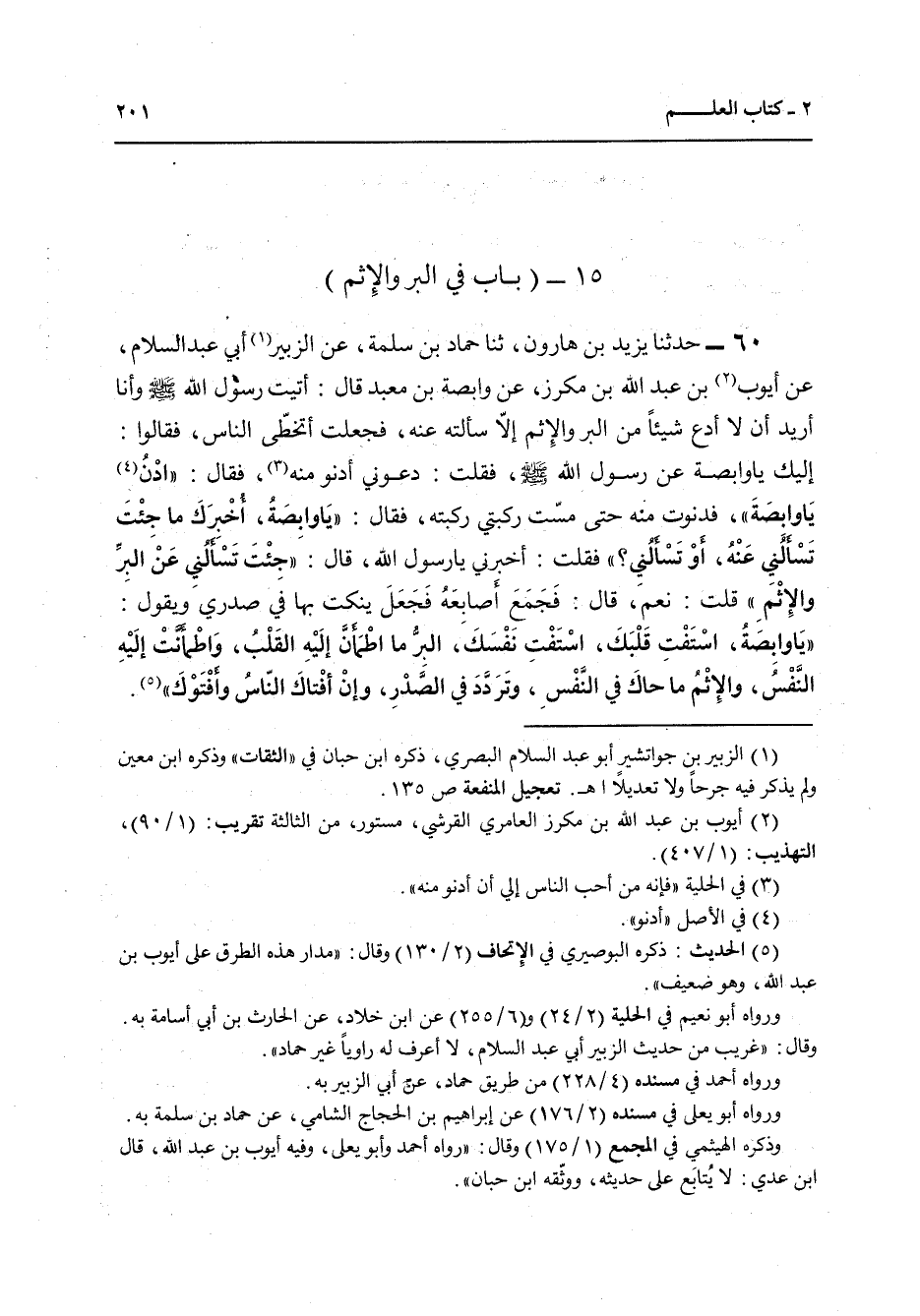 60 - حَدَّثَنَا يَزِيدُ بْنُ هَارُونَ، ثنا حَمَّادُ بْنُ سَلَمَةَ، عَنِ الزُّبَيْرِ أَبِي عَبْدِ السَّلَامِ، عَنْ أَيُّوبَ بْنِ عَبْدِ اللَّهِ بْنِ مِكْرَزٍ، عَنْ وَابِصَةَ بْنِ مَعْبَدٍ قَالَ: أَتَيْتُ رَسُولَ اللَّهِ صَلَّى اللهُ عَلَيْهِ وَسَلَّمَ وَأَنَا أُرِيدُ أَنْ لَا أَدَعَ شَيْئًا مِنَ الْبِرِّ وَالْإِثْمِ إِلَّا سَأَلْتُهُ عَنْهُ , فَجَعَلْتُ أَتَخَطَّى النَّاسَ فَقَالُوا: إِلَيْكَ يَا وَابِصَةُ عَنْ رَسُولِ اللَّهِ صَلَّى اللهُ عَلَيْهِ وَسَلَّمَ فَقُلْتُ: دَعُونِي أَدْنُو مِنْهُ فَقَالَ: «ادْنُ يَا وَابِصَةُ» , فَدَنَوْتُ مِنْهُ حَتَّى مَسَّتْ رُكْبَتِي رُكْبَتَهُ فَقَالَ: «يَا وَابِصَةُ أُخْبِرُكَ مَا جِئْتَ تَسْأَلُنِي عَنْهُ أَوْ تَسْأَلُنِي؟» فَقُلْتُ: أَخْبِرْنِي يَا رَسُولَ اللَّهِ قَالَ: «جِئْتَ تَسْأَلُنِي عَنِ الْبِرِّ وَالْإِثْمِ» , قُلْتُ: نَعَمْ قَالَ: فَجَمَعَ أَصَابِعَهُ فَجَعَلَ يَنْكُتُ بِهَا فِي صَدْرِي وَيَقُولُ: «يَا وَابِصَةُ اسْتَفْتِ قَلْبَكَ اسْتَفْتِ نَفْسَكَ , §الْبِرُّ مَا اطْمَأَنَّ إِلَيْهِ الْقَلْبُ وَاطْمَأَنَّتْ إِلَيْهِ النَّفْسُ وَالْإِثْمُ مَا حَاكَ فِي النَّفْسِ وَتَرَدَّدَ فِي الصَّدْرِ وَإِنْ أَفْتَاكَ النَّاسُ وَأَفْتَوْكَ»