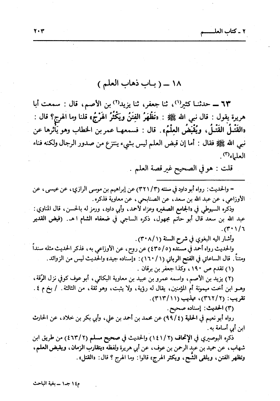 63 - حَدَّثَنَا كَثِيرٌ، ثنا جَعْفَرٌ، ثنا يَزِيدُ بْنُ الْأَصَمِّ قَالَ: سَمِعْتُ أَبَا هُرَيْرَةَ يَقُولُ: قَالَ نَبِيُّ اللَّهِ صَلَّى اللهُ عَلَيْهِ وَسَلَّمَ: «§تَظْهَرُ الْفِتَنُ وَيَكْثُرُ الْهَرَجُ» قُلْنَا وَمَا الْهَرَجُ؟ قَالَ: الْقَتْلُ الْقَتْلُ وَيُقْبَضُ الْعِلْمُ " قَالَ: فَسَمِعَهَا عُمَرُ بْنُ الْخَطَّابِ وَهُوَ يَأْثِرُهَا عَنْ نَبِيِّ اللَّهِ صَلَّى اللهُ عَلَيْهِ وَسَلَّمَ فَقَالَ: «أَمَا إِنَّ قَبْضَ الْعِلْمِ لَيْسَ بِشَيْءٍ يُنْتَزَعُ مِنْ صُدُورِ الرِّجَالِ وَلَكِنَّهُ فَنَاءُ الْعُلَمَاءِ» قُلْتُ: هُوَ فِي الصَّحِيحِ غَيْرُ قِصَّةِ الْعِلْمِ