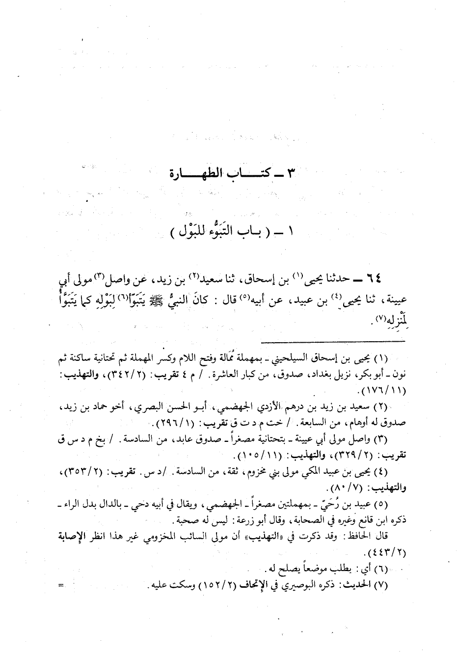 64 - حَدَّثَنَا يَحْيَى بْنُ إِسْحَاقَ، ثنا سَعِيدُ بْنُ زَيْدٍ، عَنْ وَاصِلٍ مَوْلَى أَبِي عُيَيْنَةَ , ثنا يَحْيَى بْنُ عُبَيْدٍ، عَنْ أَبِيهِ، قَالَ: كَانَ النَّبِيُّ صَلَّى اللهُ عَلَيْهِ وَسَلَّمَ «§يَتَبَوَّأُ لِبَوْلِهِ كَمَا يَتَبَوَّأُ لِمَنْزِلِهِ»