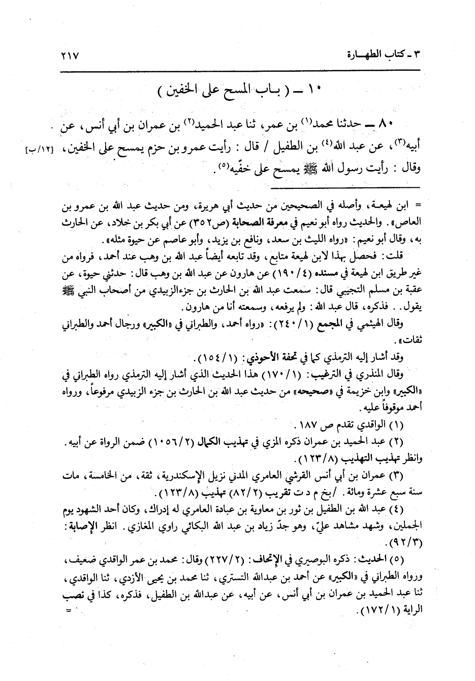 80 - حَدَّثَنَا مُحَمَّدُ بْنُ عُمَرَ، ثنا عَبْدُ الْحَمِيدِ بْنُ عِمْرَانَ بْنِ أَبِي أَنَسٍ، عَنْ أَبِيهِ، عَنْ عَبْدِ اللَّهِ بْنِ الطُّفَيْلِ، قَالَ: رَأَيْتُ عَمْرَو بْنَ حَزْمٍ يَمْسَحُ عَلَى الْخُفَّيْنِ وَقَالَ: رَأَيْتُ رَسُولَ اللَّهِ صَلَّى اللهُ عَلَيْهِ وَسَلَّمَ «§يَمْسَحُ عَلَى خُفَّيْهِ»