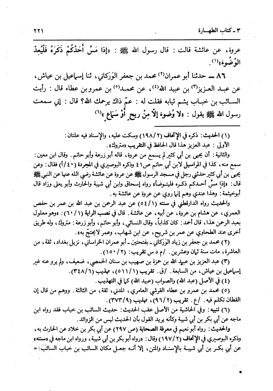 86 - حَدَّثَنَا أَبُو عِمْرَانَ مُحَمَّدُ بْنُ جَعْفَرٍ الْوَرْكَانِيُّ , ثنا إِسْمَاعِيلُ بْنُ عَيَّاشٍ، عَنْ عَبْدِ الْعَزِيزِ بْنِ عُبَيْدِ اللَّهِ، عَنْ مُحَمَّدِ بْنِ عَمْرِو بْنِ عَطَاءٍ قَالَ: رَأَيْتُ السَّائِبَ بْنَ خَبَّابٍ يَشُمُّ ثِيَابَهُ فَقُلْتُ لَهُ: عَمَّ ذَاكَ يَرْحَمُكَ اللَّهُ؟ قَالَ: إِنِّي سَمِعْتُ رَسُولَ اللَّهِ صَلَّى اللهُ عَلَيْهِ وَسَلَّمَ يَقُولُ: «§لَا وضُوءَ إِلَّا مِنْ رِيحٍ أَوْ سَمَاعٍ»
